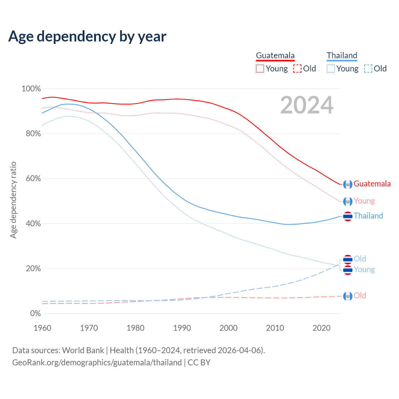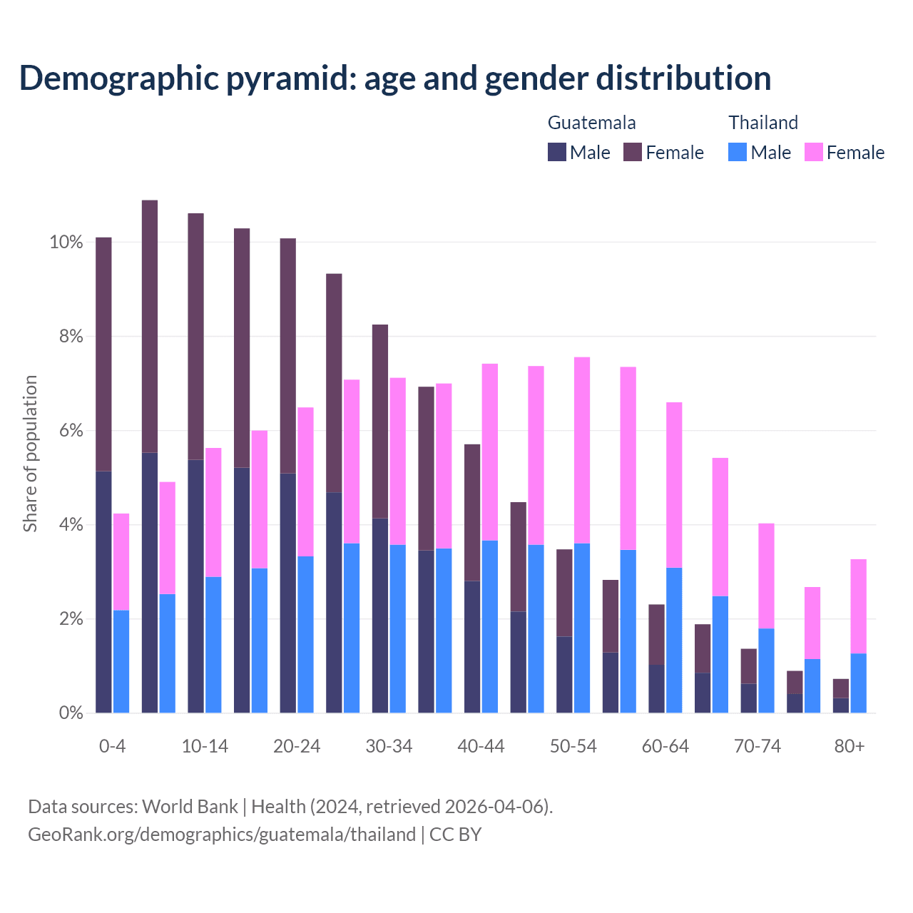 The share of older people aged 65 and over is 4.85% in Guatemala and 15.4% in Thailand. Life expectancy in Guatemala compared to Thailand .