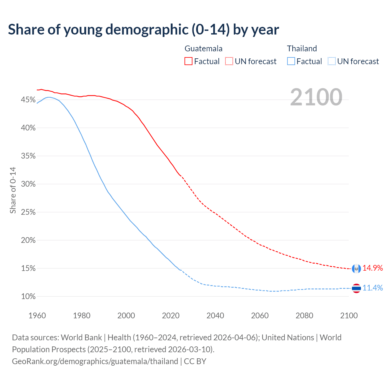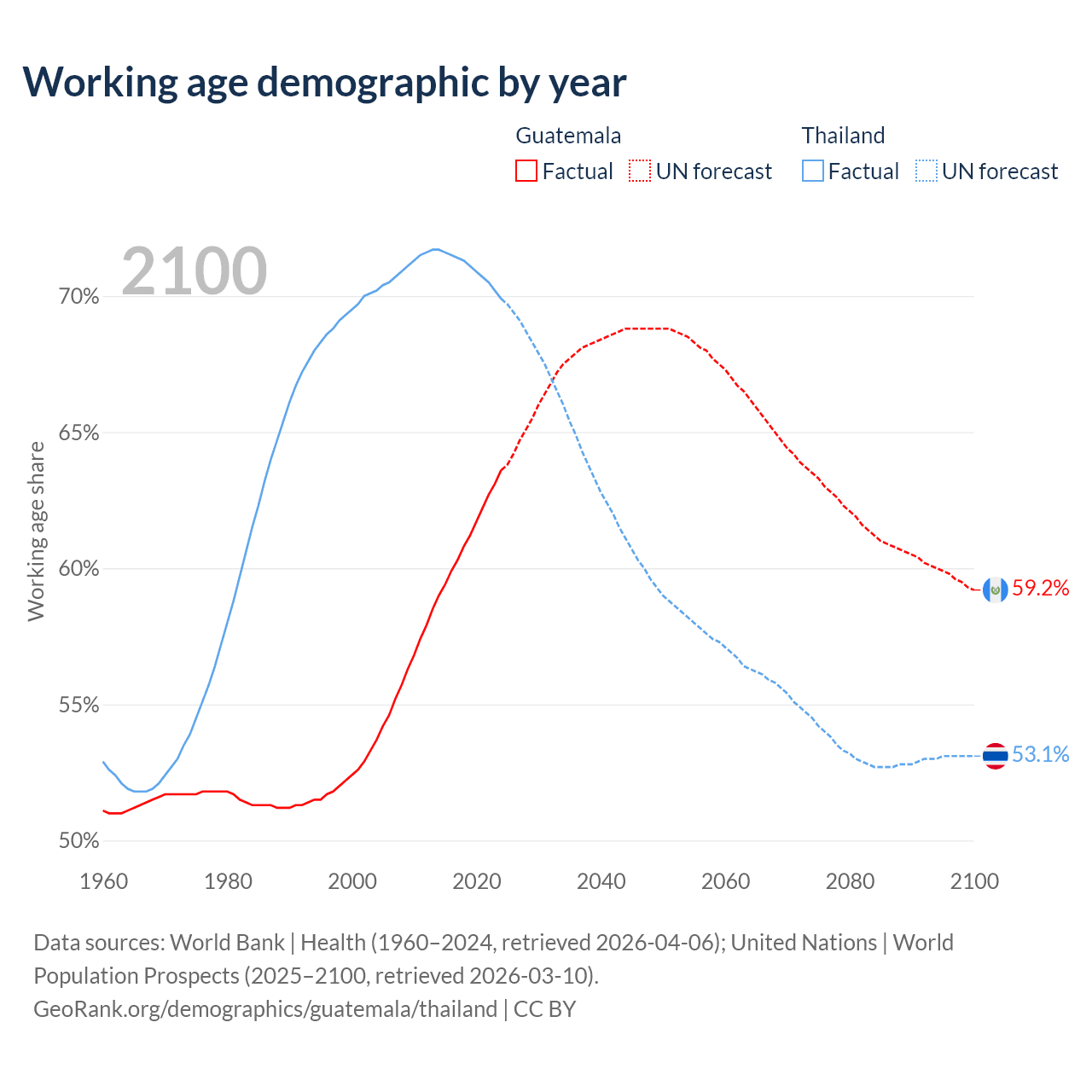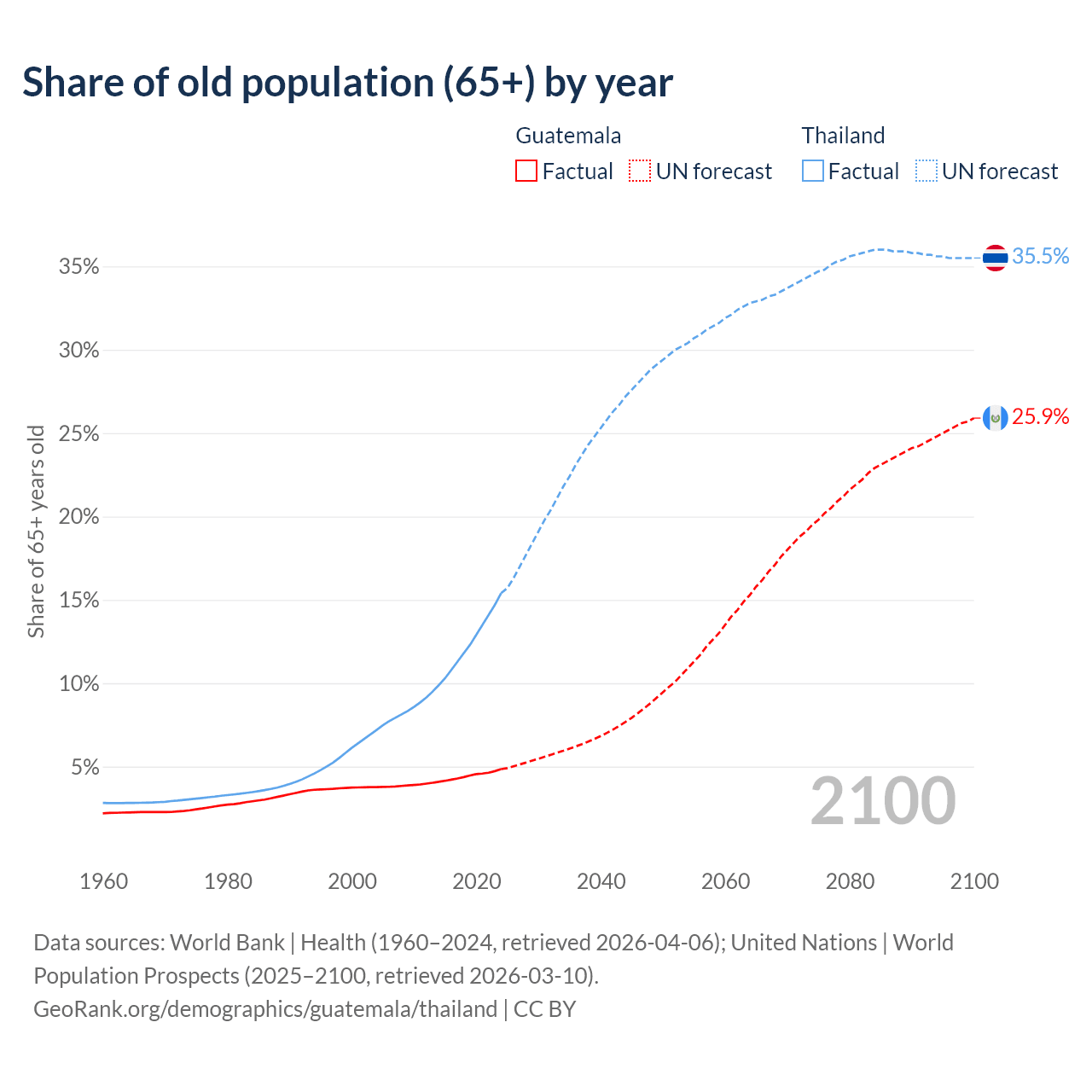 Median age Guatemala vs Thailand, 1960-2100