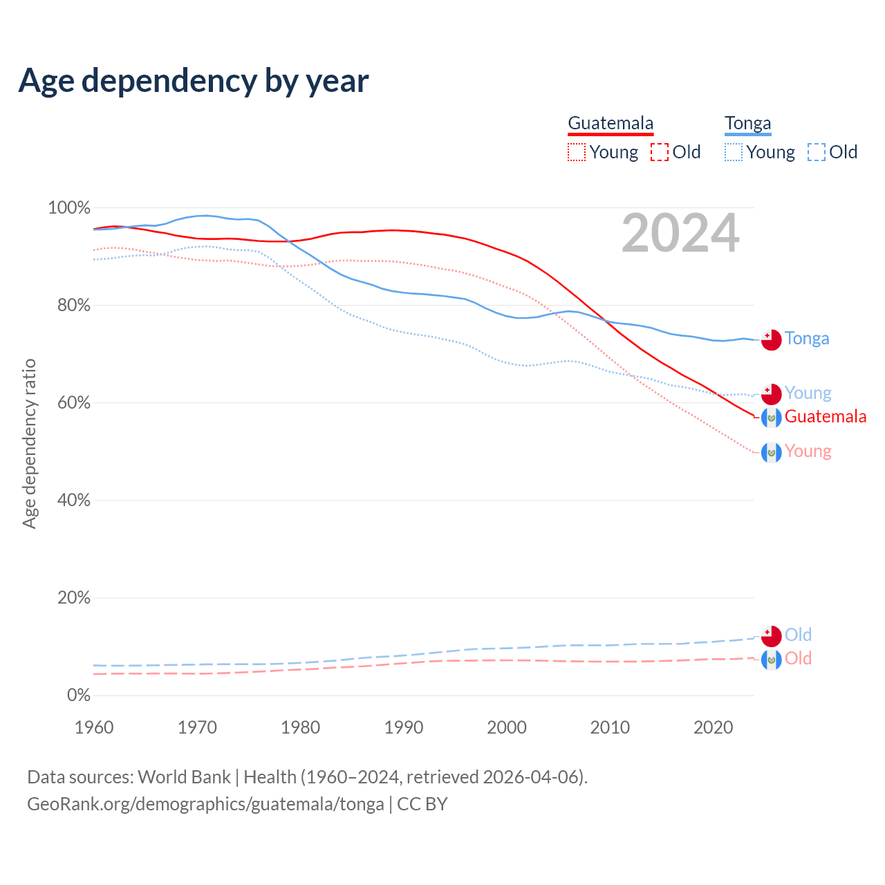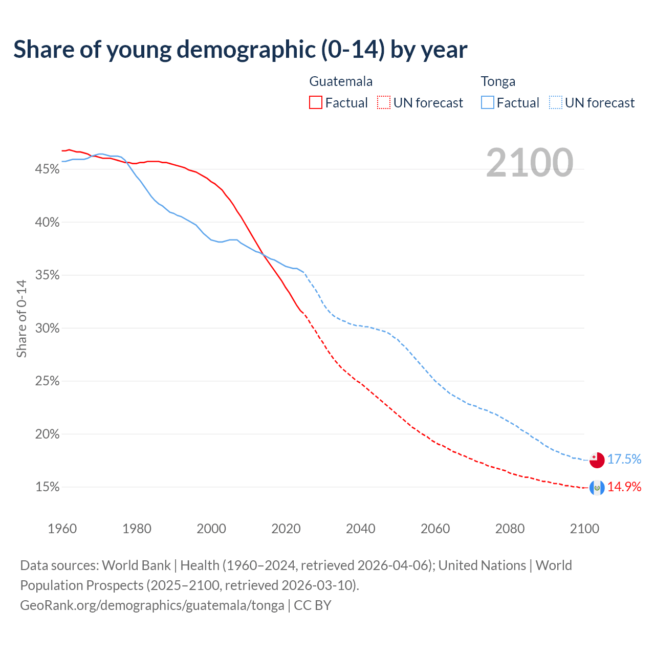 - The share of young demographic (0-15 years old) in Guatemala is 31.6% vs 35.4% in Tonga.
