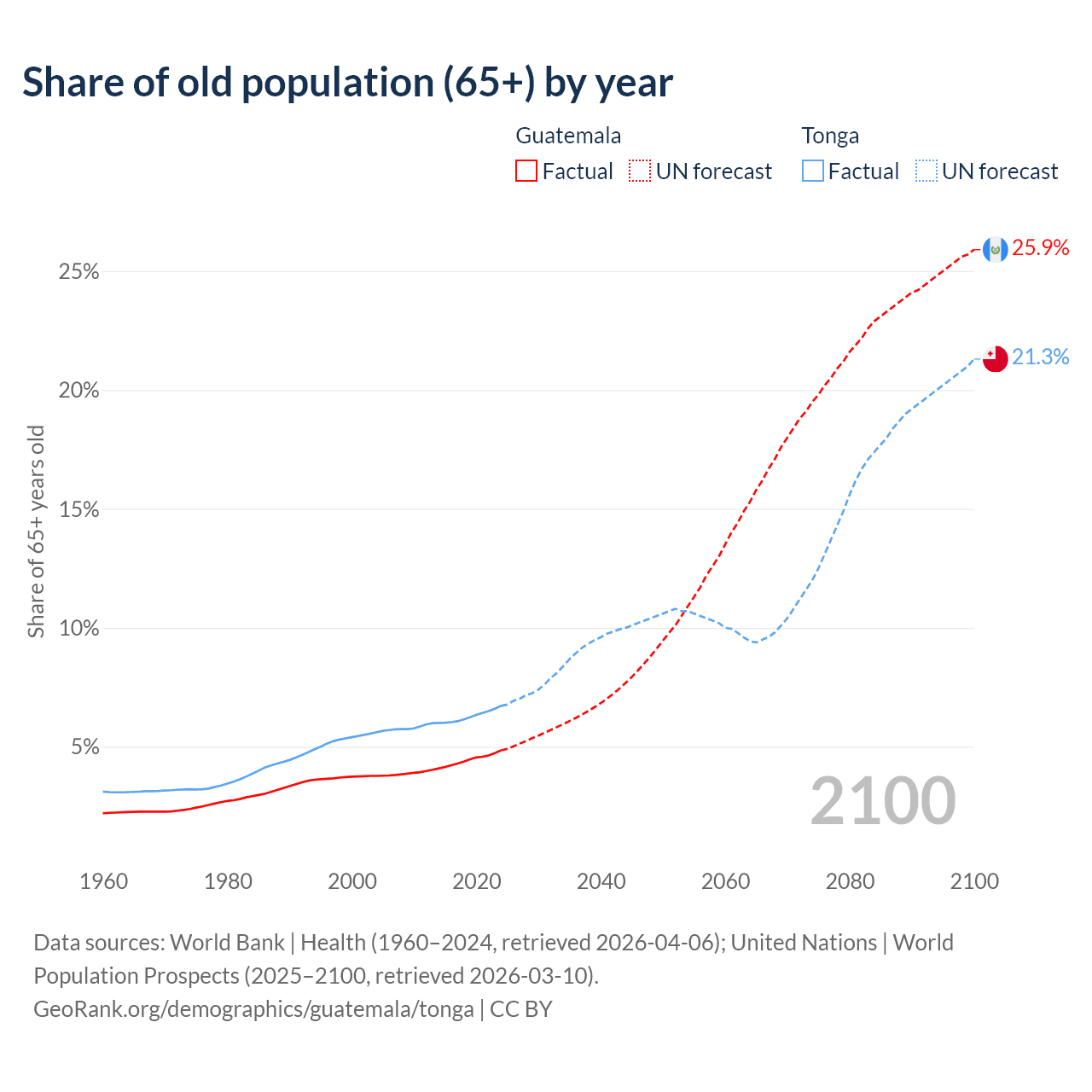 Median age Guatemala vs Tonga, 1960-2100