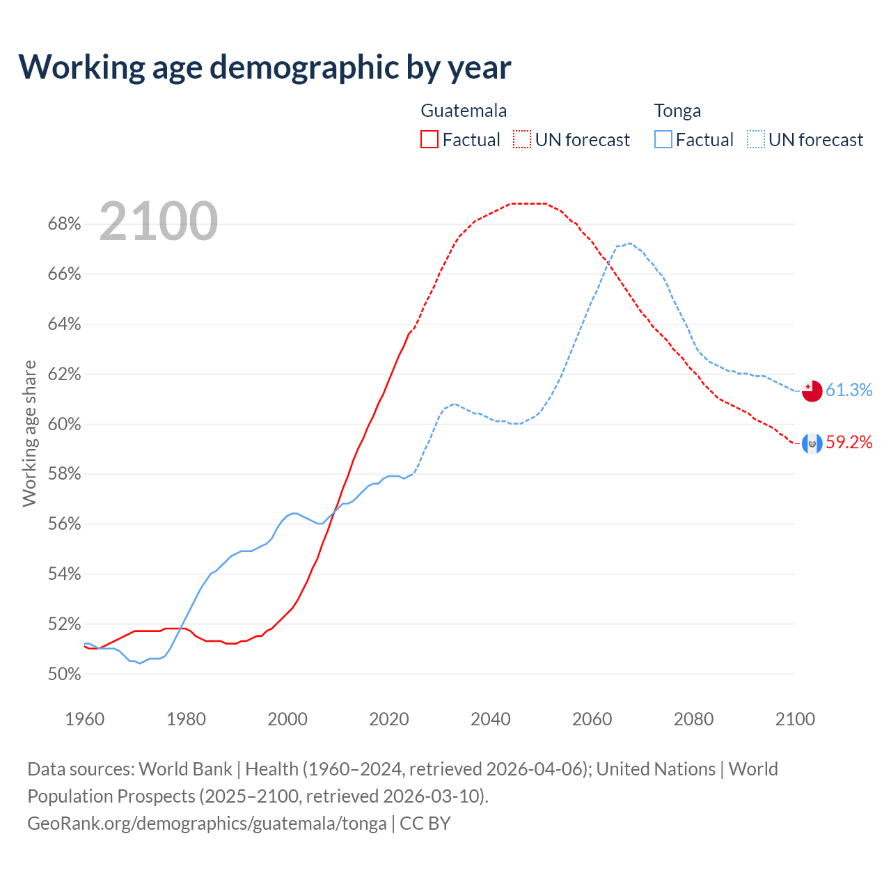 - Guatemala has 12.1M working age adults (aged 15-64) vs 59.8K in Tonga.