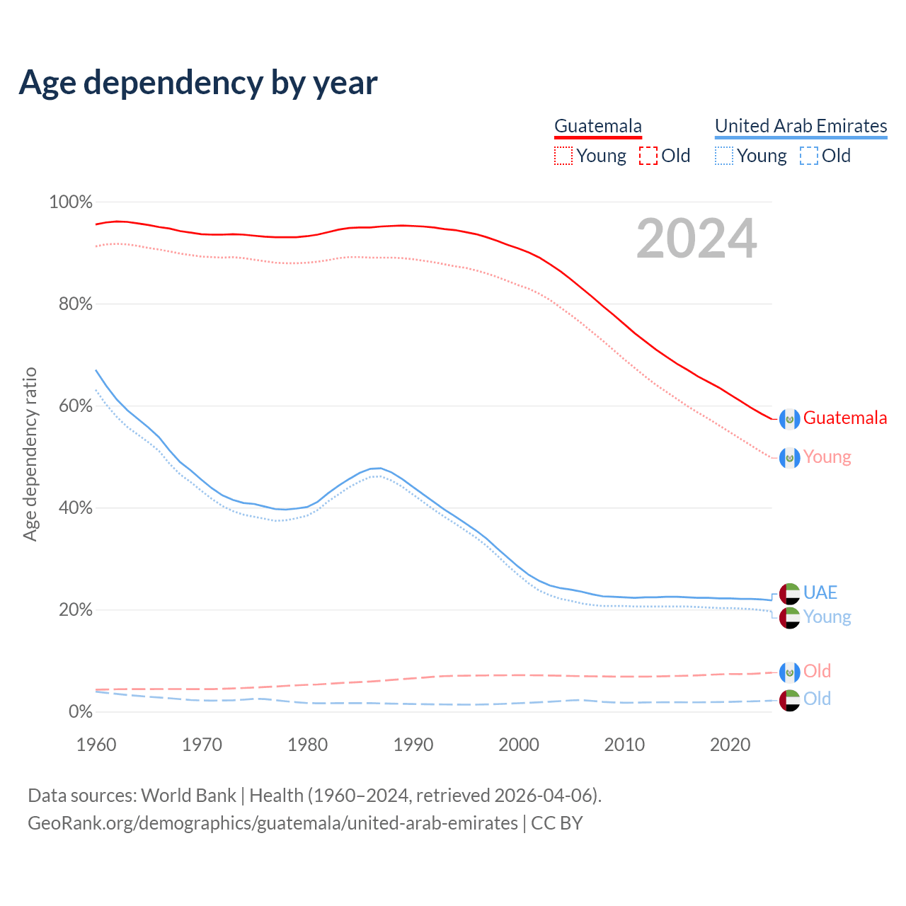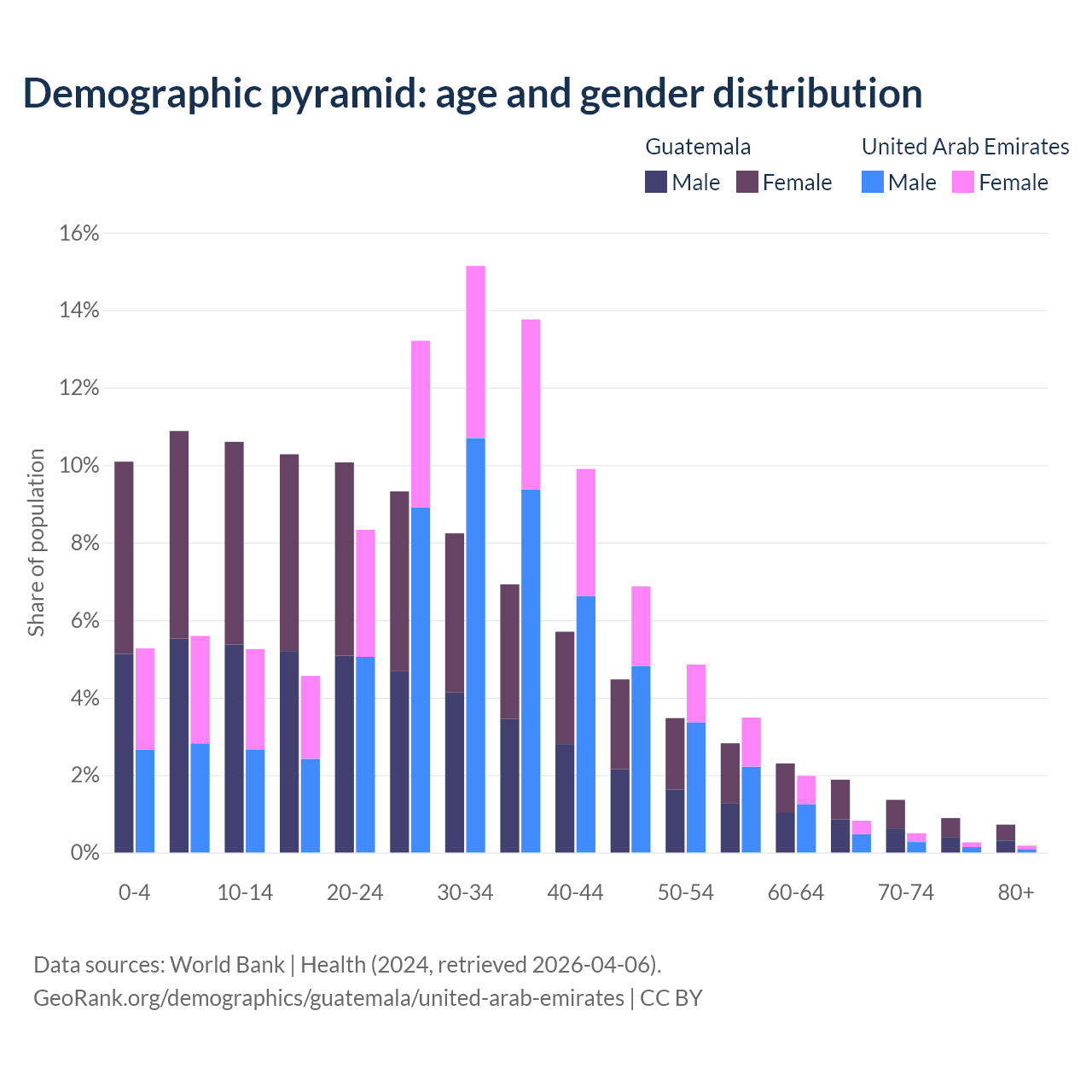 - Guatemala is ranked 137/196 by median age (oldest to youngest) vs 91/196 for the United Arab Emirates.