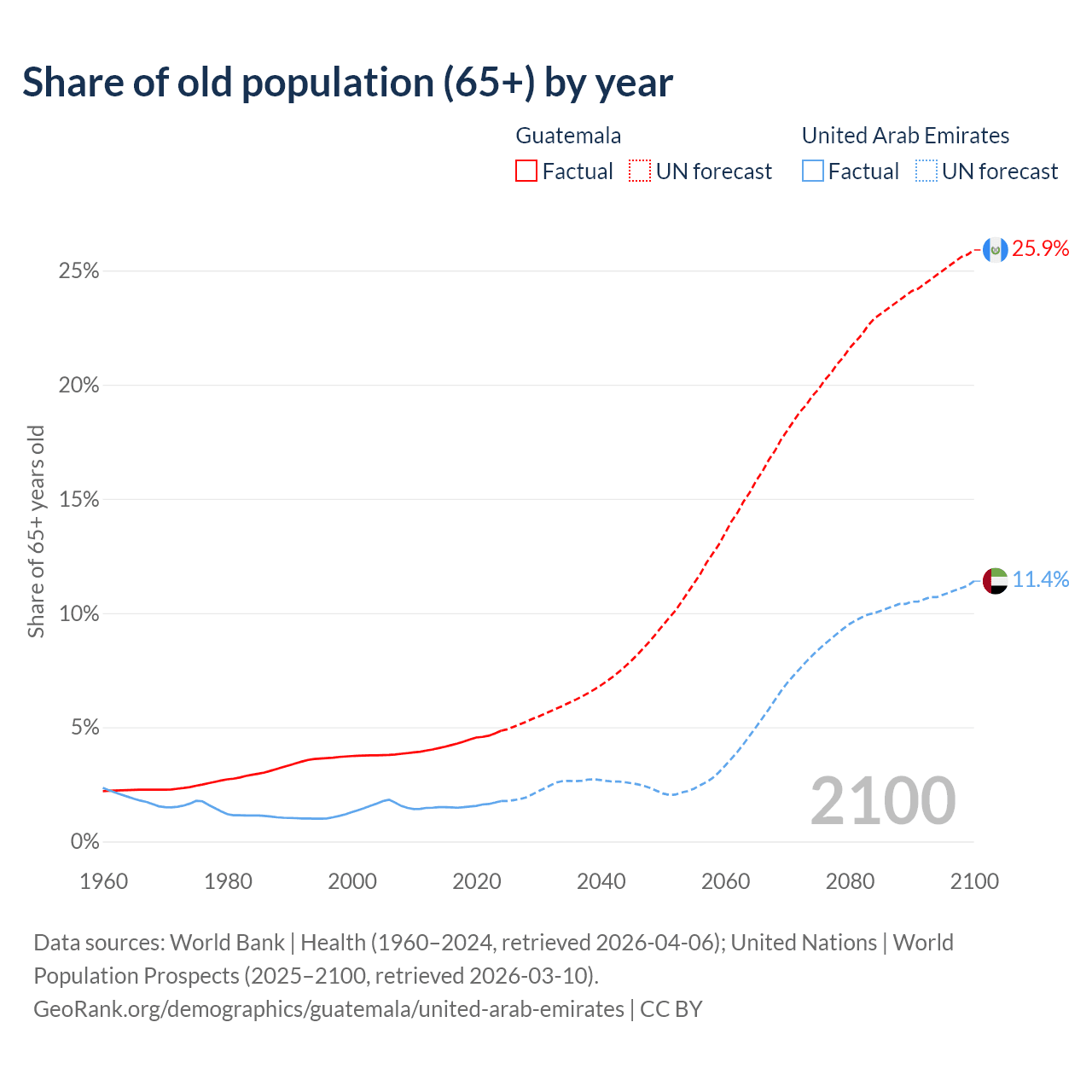 - The share of old-age demographic (65+) in Guatemala is 4.85% vs 1.77% in the United Arab Emirates.