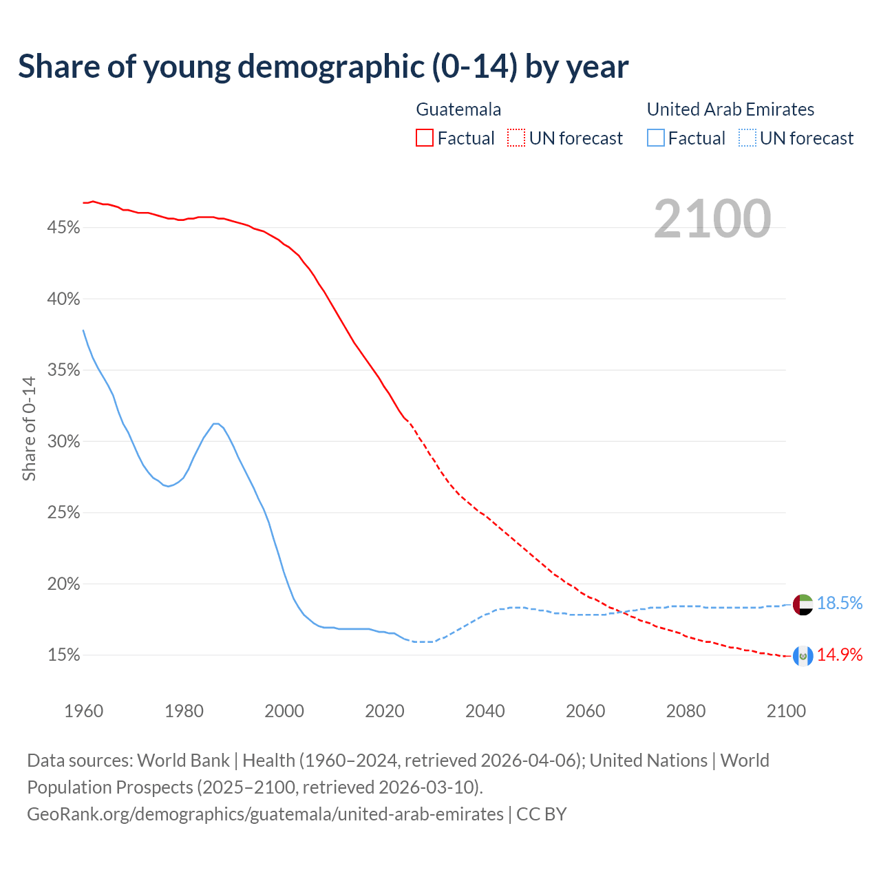 - The share of young demographic (0-15 years old) in Guatemala is 31.6% vs 16.1% in the United Arab Emirates.