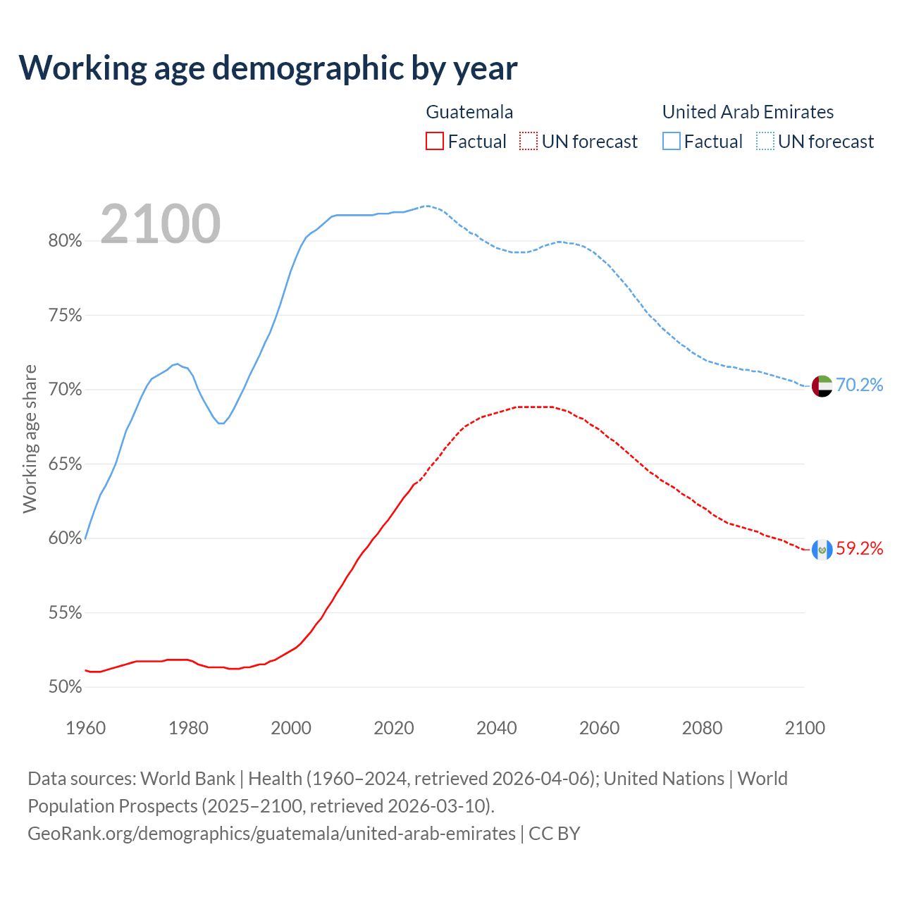 - Guatemala has 12.1M working age adults (aged 15-64) vs 9.6M in the United Arab Emirates.