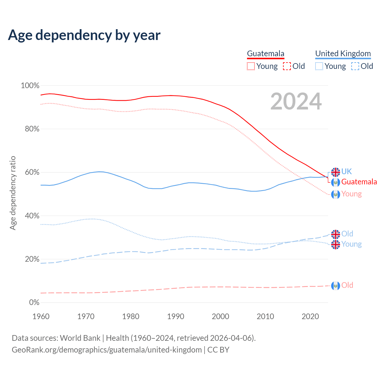 Data sources: World Bank | Health (1960–2024, retrieved 2026-04-06); U.S. Census Bureau (1960–2024, retrieved 2026-02-08).