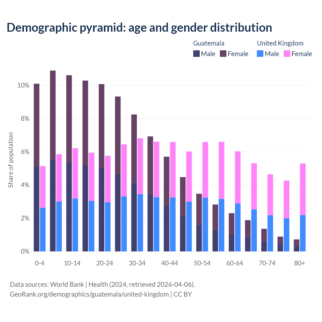 - The share of old-age demographic (65+) in Guatemala is 4.85% vs 19.5% in the United Kingdom.