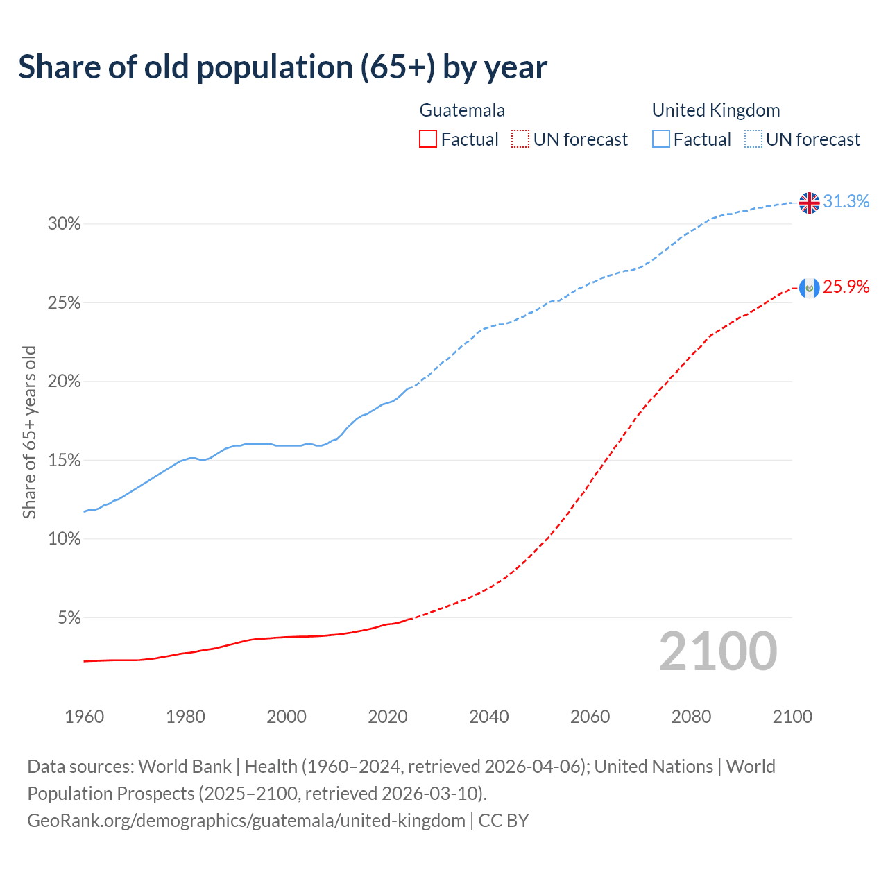 The share of older people aged 65 and over is 4.85% in Guatemala and 19.5% in the United Kingdom. Life expectancy in Guatemala compared to the United Kingdom .