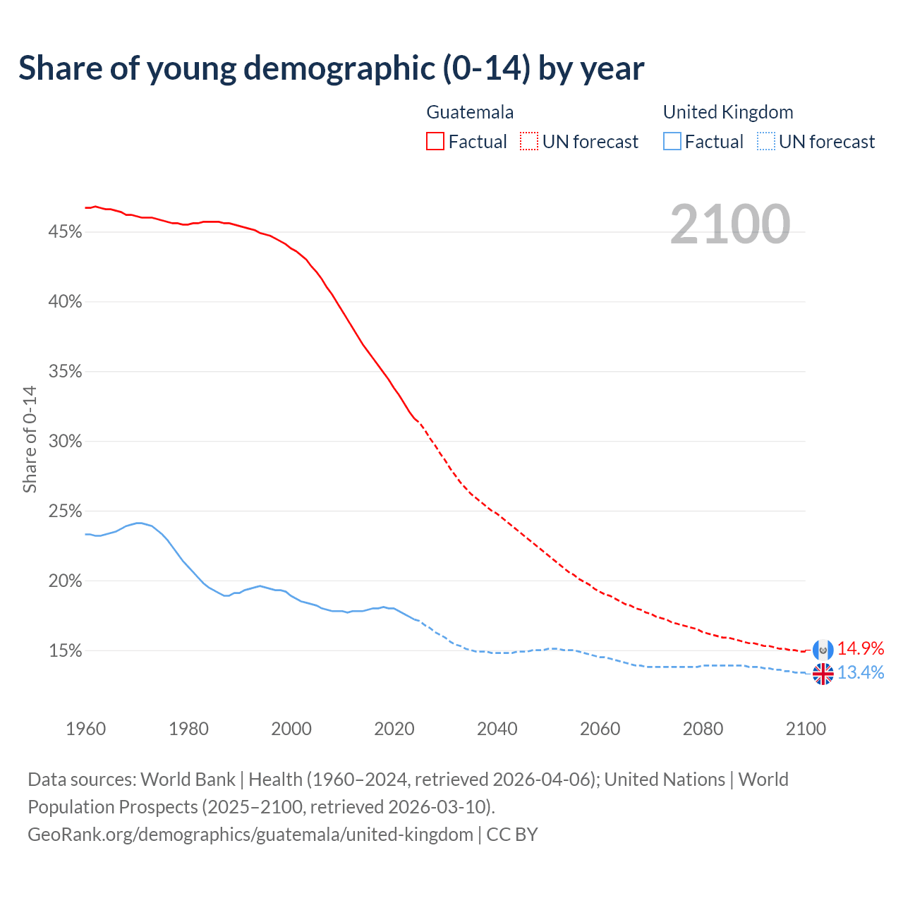 - The share of young demographic (0-15 years old) in Guatemala is 31.6% vs 17.2% in the United Kingdom.