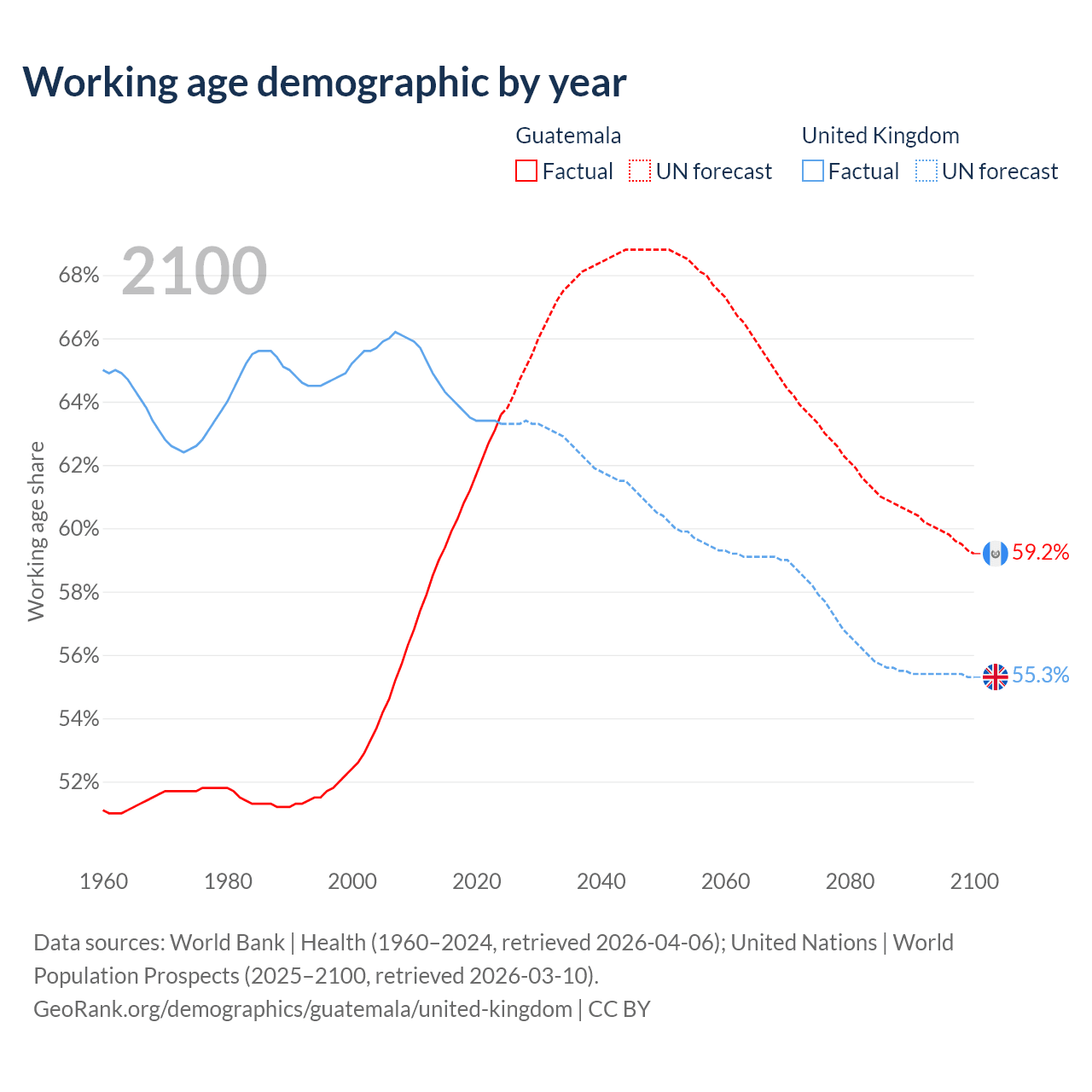 Median age Guatemala vs United Kingdom, 1960-2100