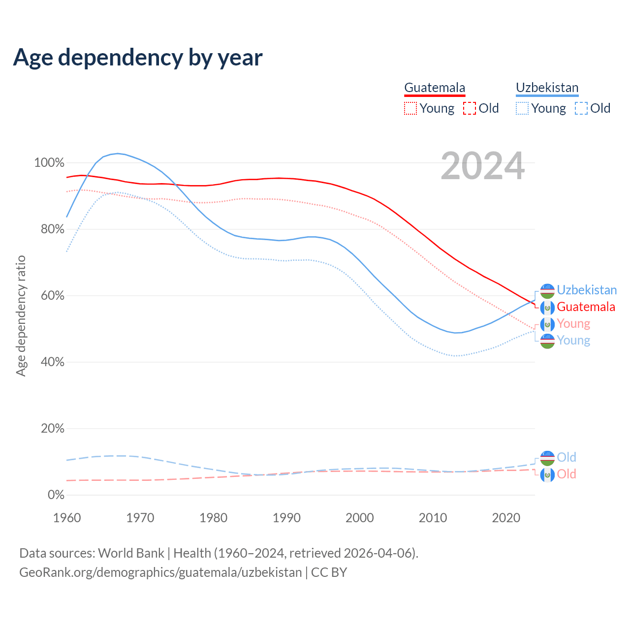 Data sources: World Bank | Health (1960–2024, retrieved 2026-04-06); U.S. Census Bureau (1960–2024, retrieved 2026-02-08).
