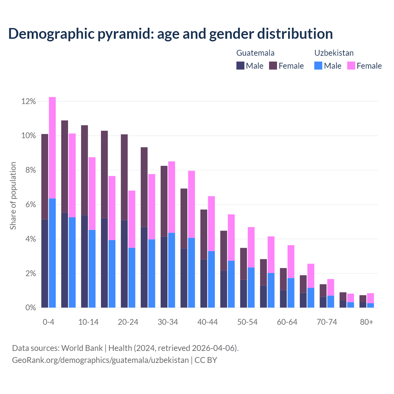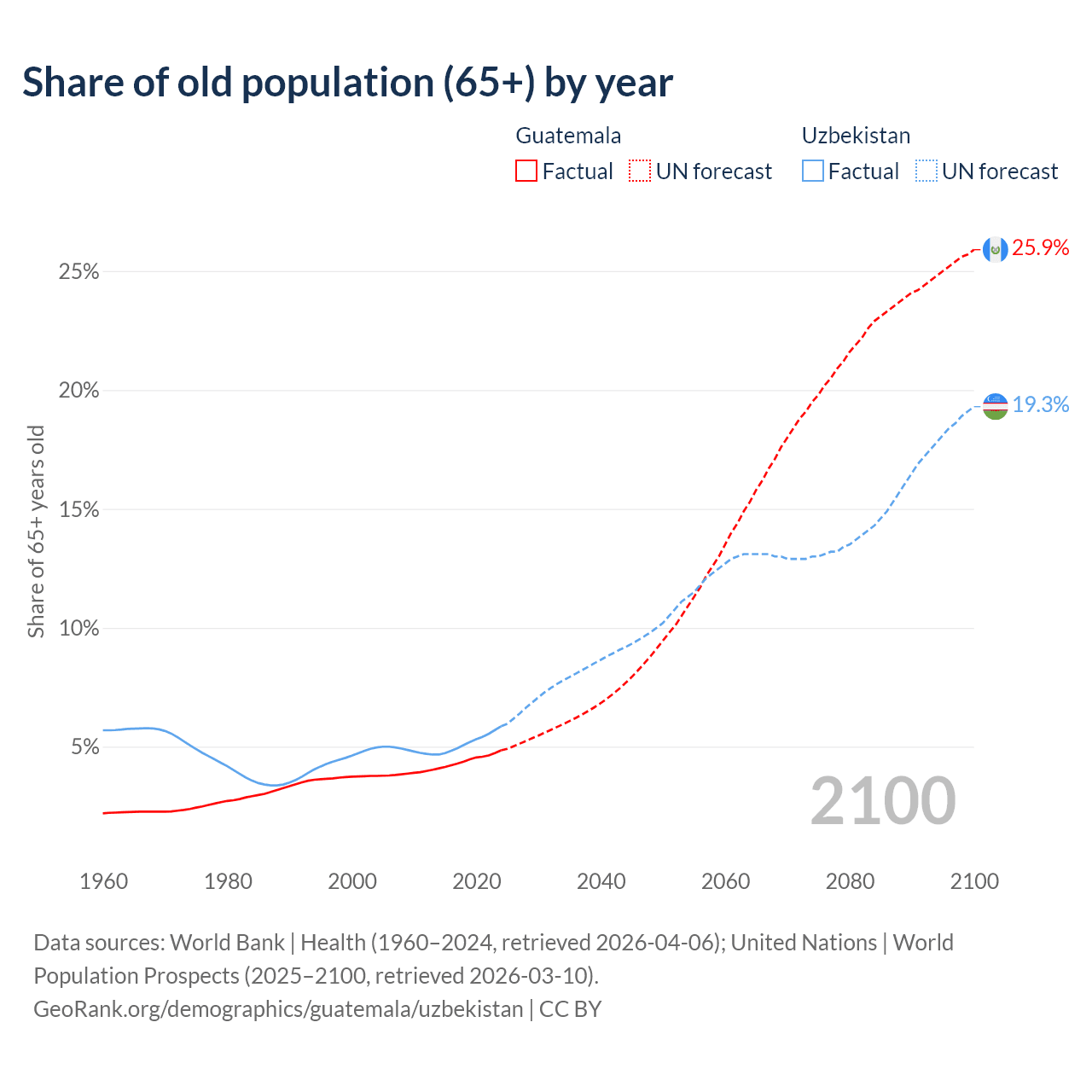 - The share of old-age demographic (65+) in Guatemala is 4.85% vs 5.86% in Uzbekistan.