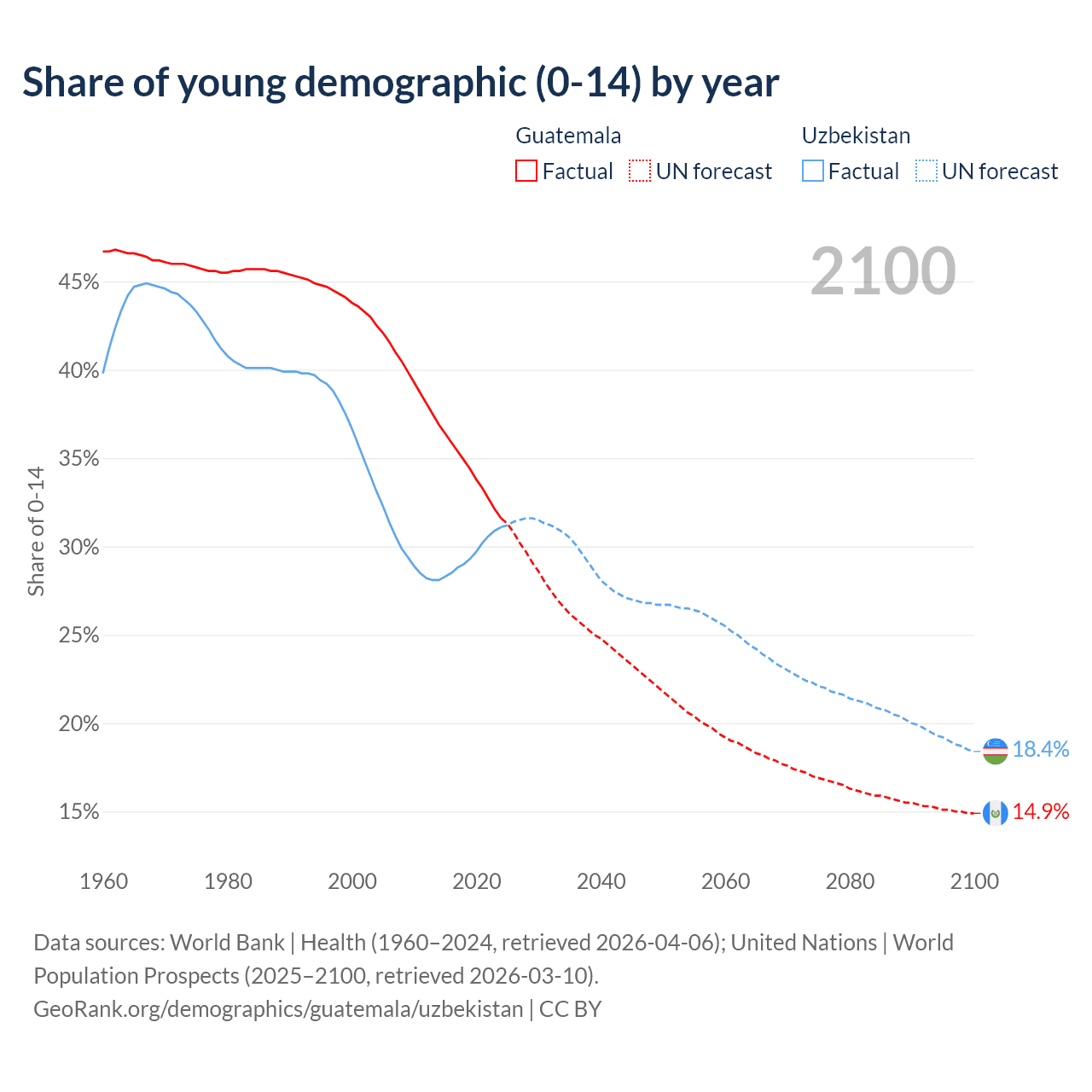 - The share of young demographic (0-15 years old) in Guatemala is 31.6% vs 31.1% in Uzbekistan.