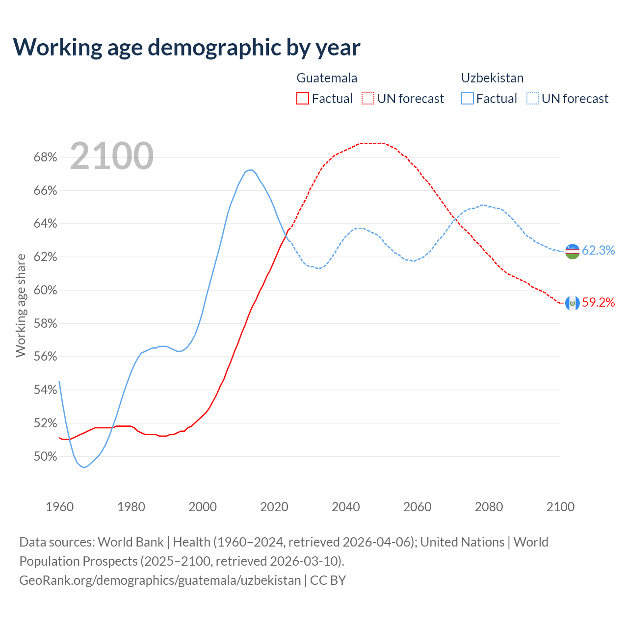 Median age Guatemala vs Uzbekistan, 1960-2100