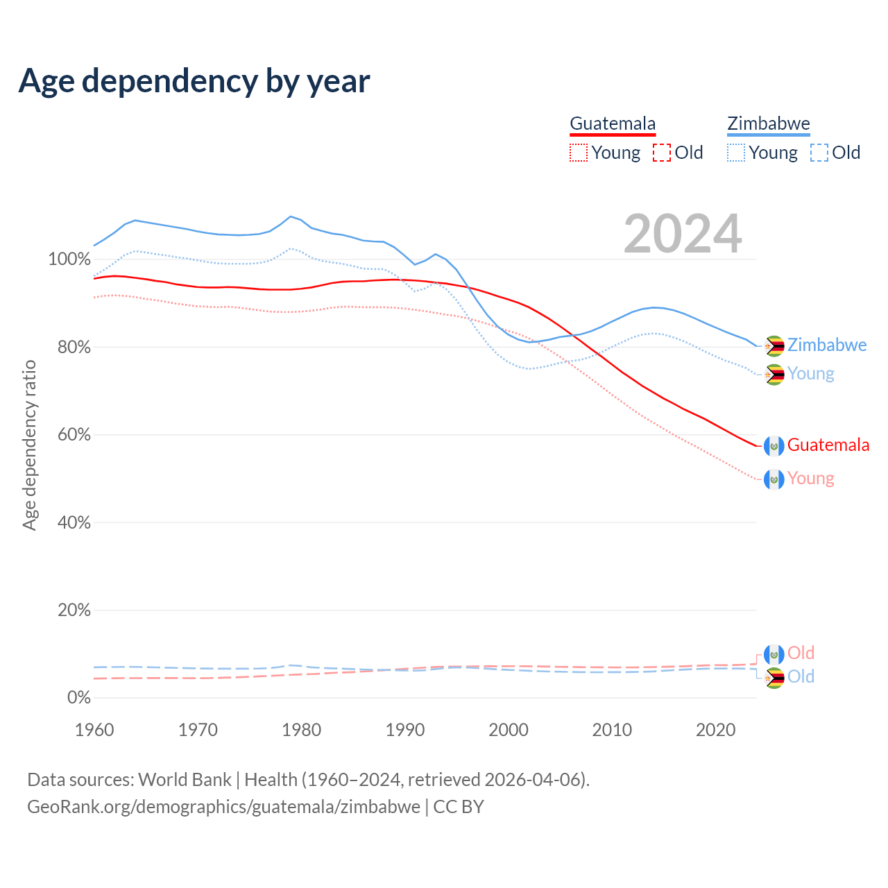- The share of old-age demographic (65+) in Guatemala is 4.85% vs 3.6% in Zimbabwe.