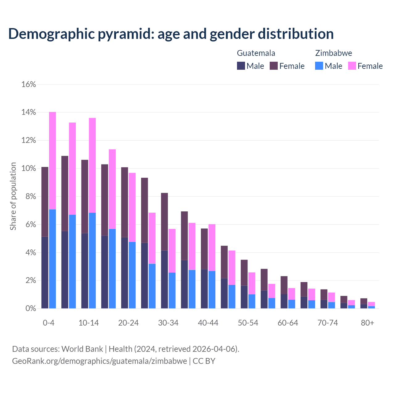 - As of 2026, the population of Guatemala is 19M vs 17.4M in Zimbabwe.
