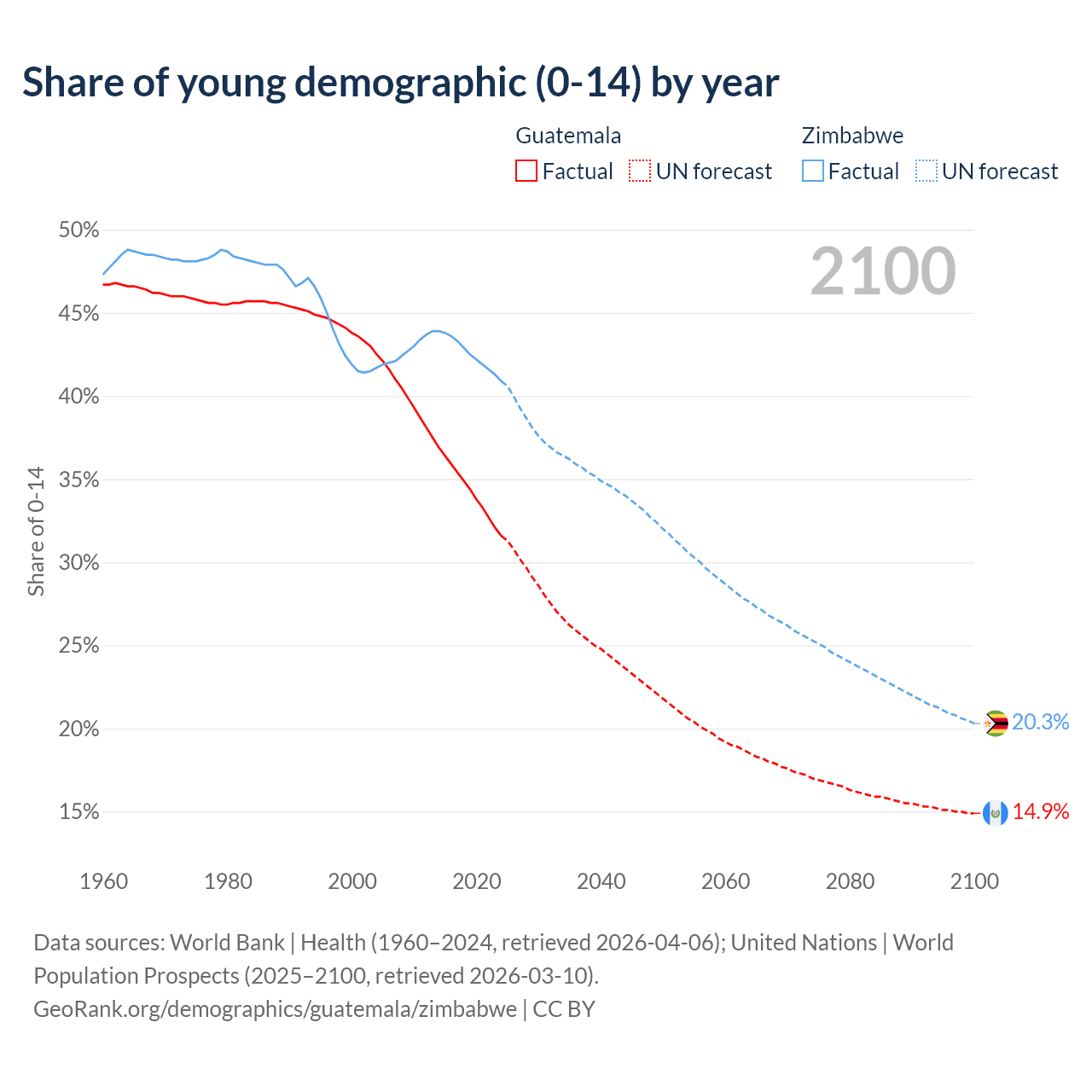 - The share of young demographic (0-15 years old) in Guatemala is 31.6% vs 40.9% in Zimbabwe.