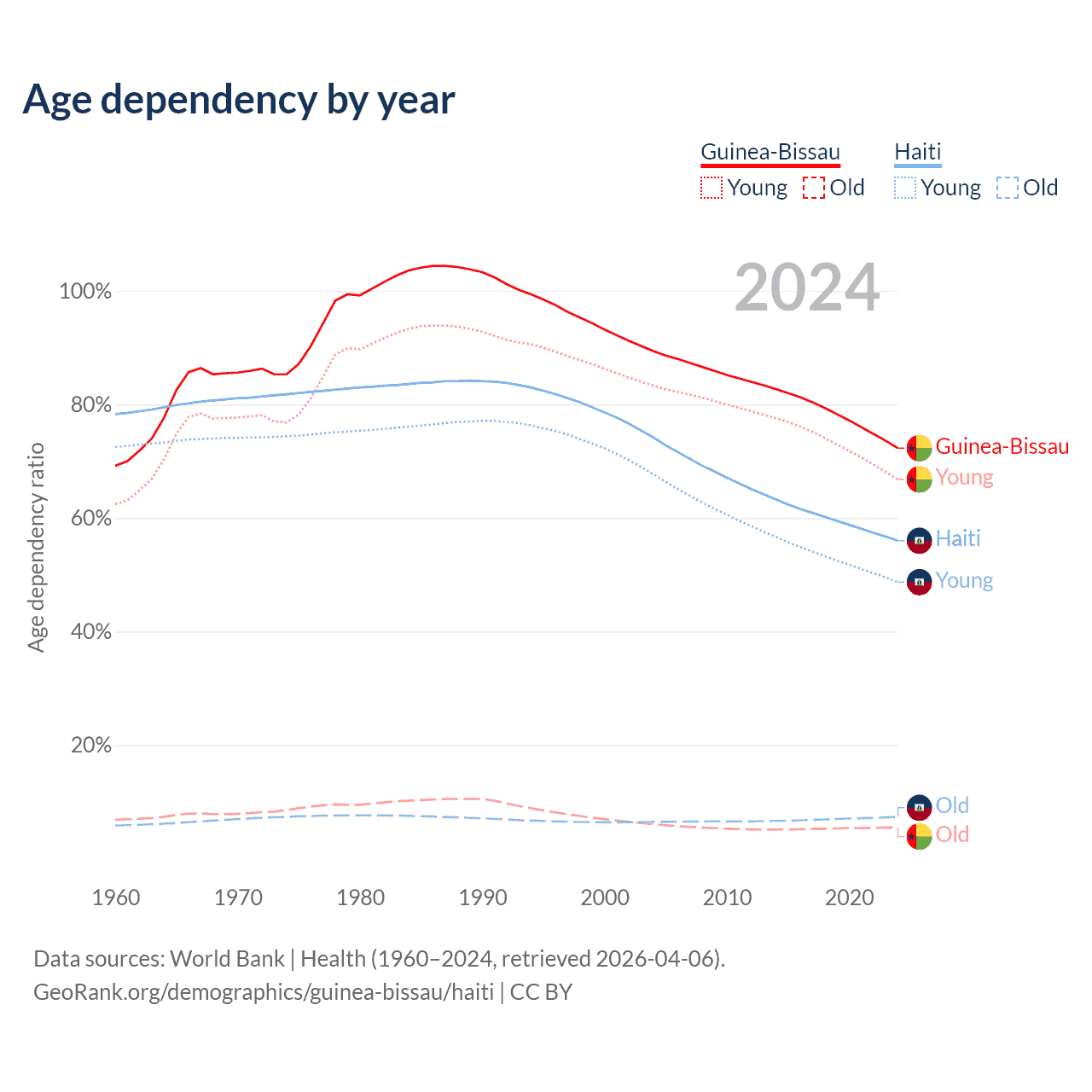- The share of old-age demographic (65+) in Guinea-Bissau is 3.19% vs 4.71% in Haiti.