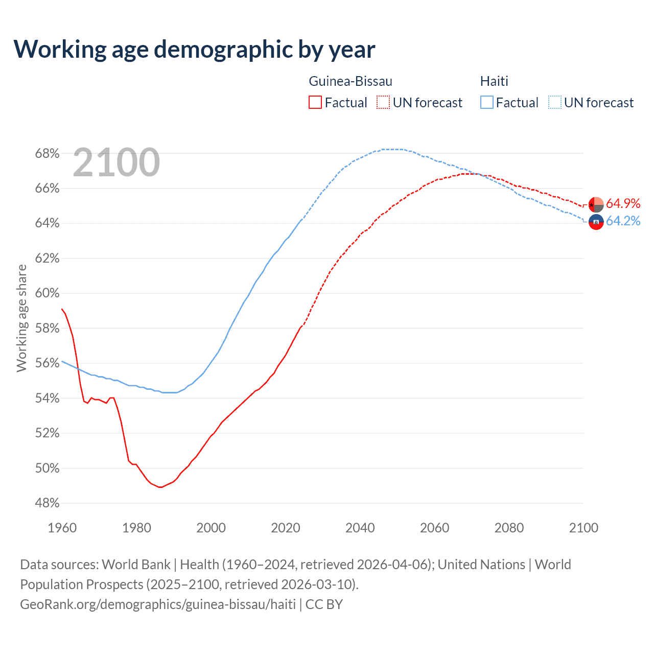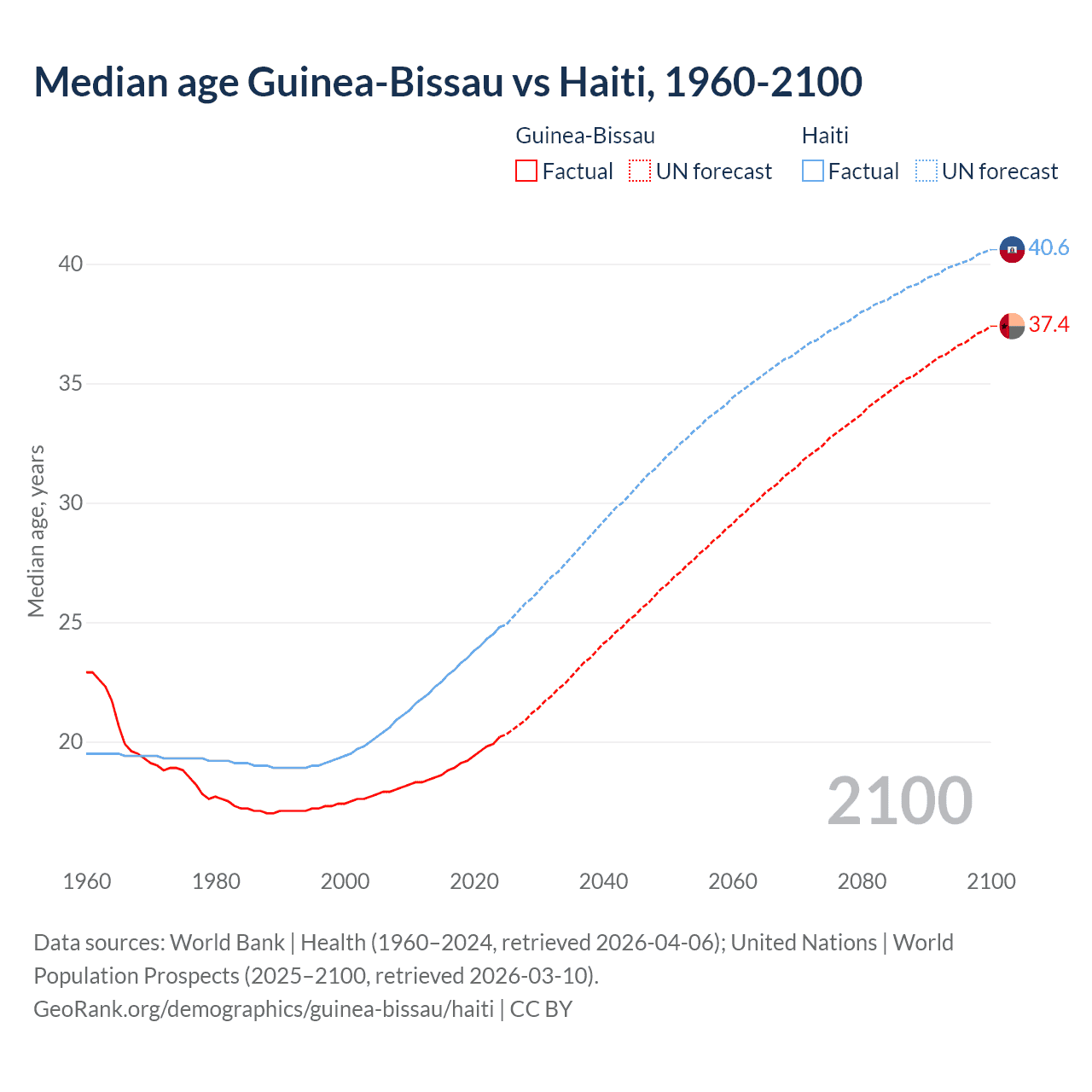 Median age Guinea-Bissau vs Haiti, 1960-2100