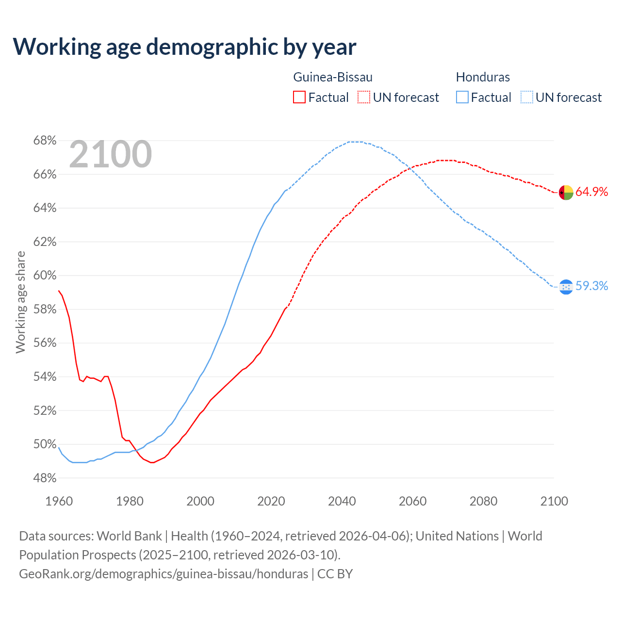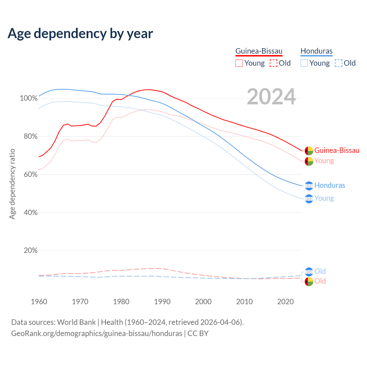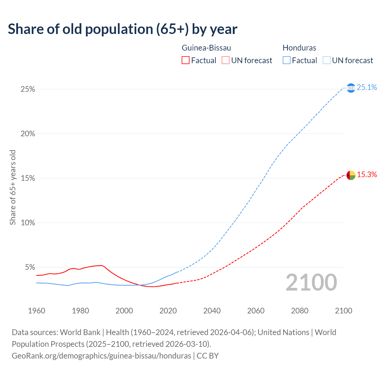 - The share of old-age demographic (65+) in Guinea-Bissau is 3.19% vs 4.42% in Honduras.