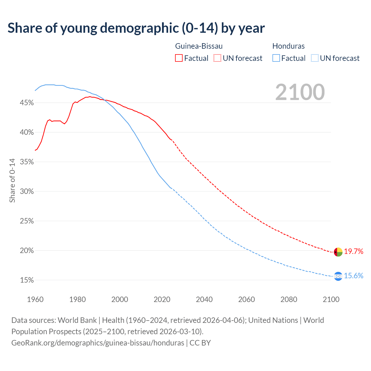 - The share of young demographic (0-15 years old) in Guinea-Bissau is 38.8% vs 30.6% in Honduras.