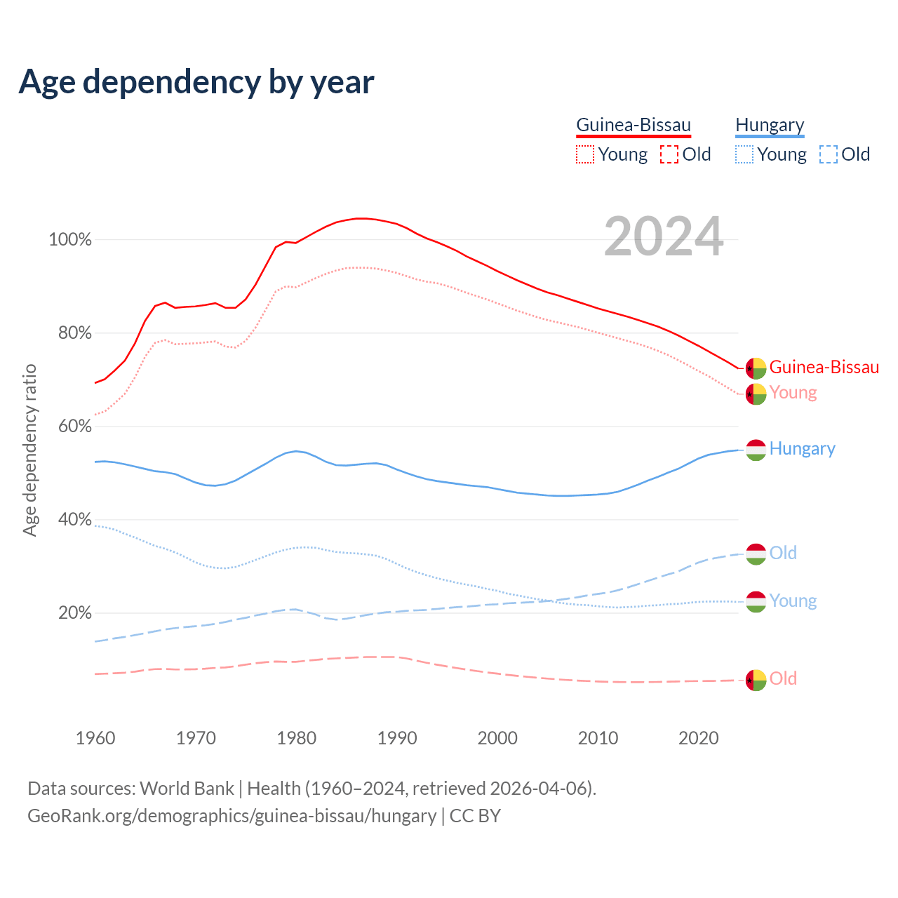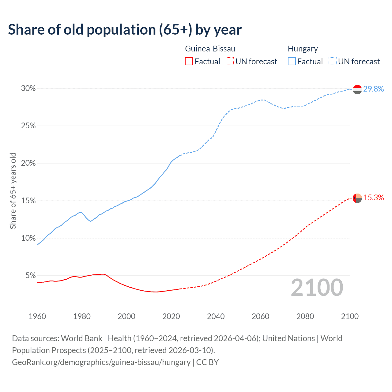 - The share of old-age demographic (65+) in Guinea-Bissau is 3.19% vs 21% in Hungary.