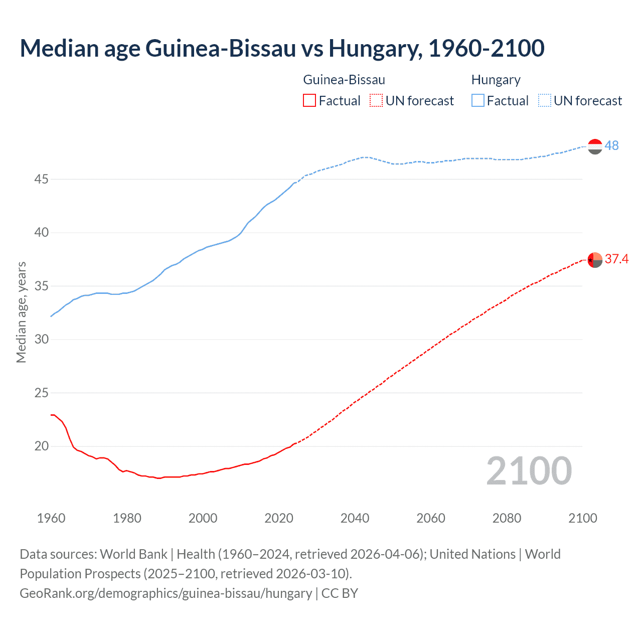 Median age Guinea-Bissau vs Hungary, 1960-2100