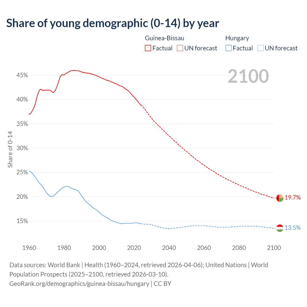 - The share of young demographic (0-15 years old) in Guinea-Bissau is 38.8% vs 14.4% in Hungary.