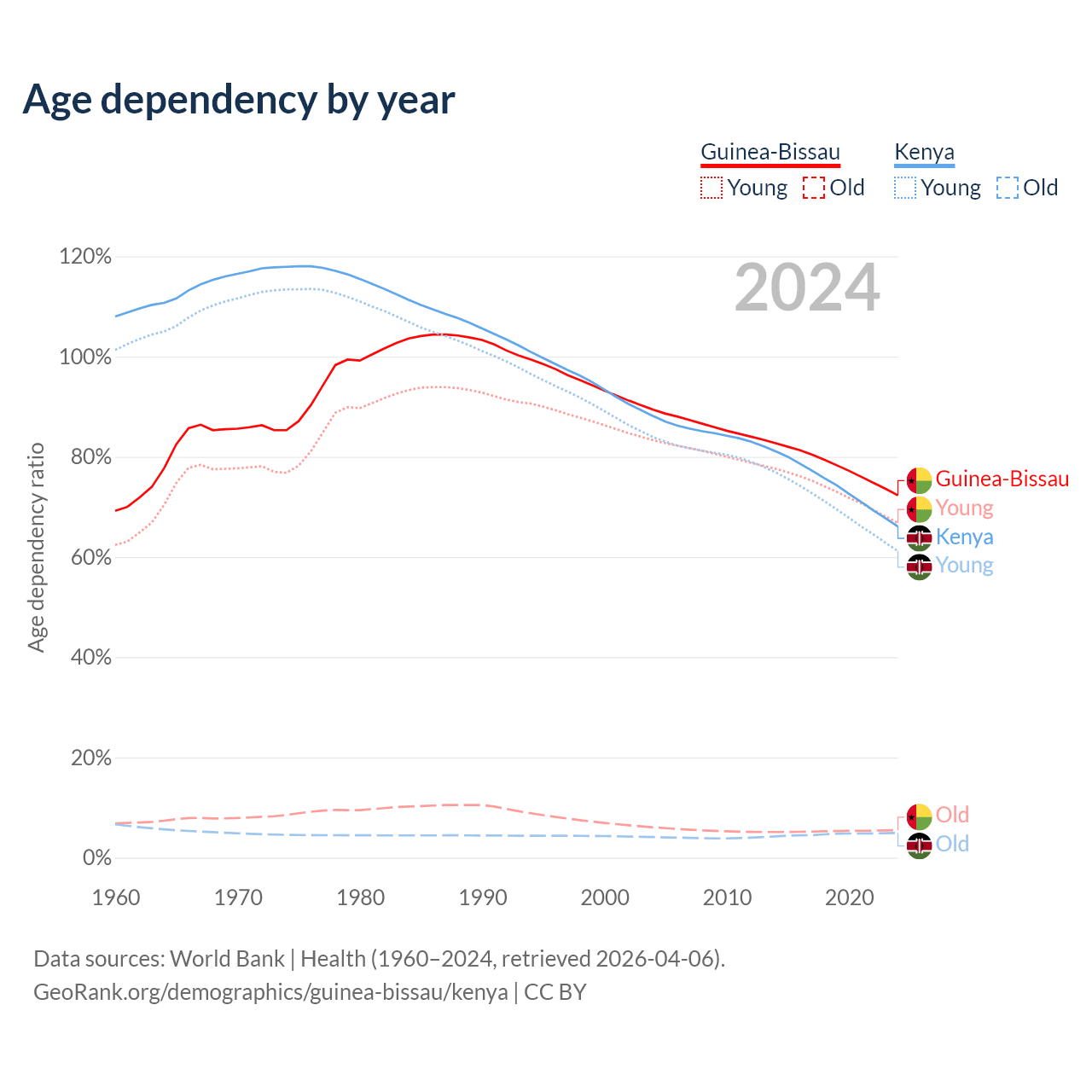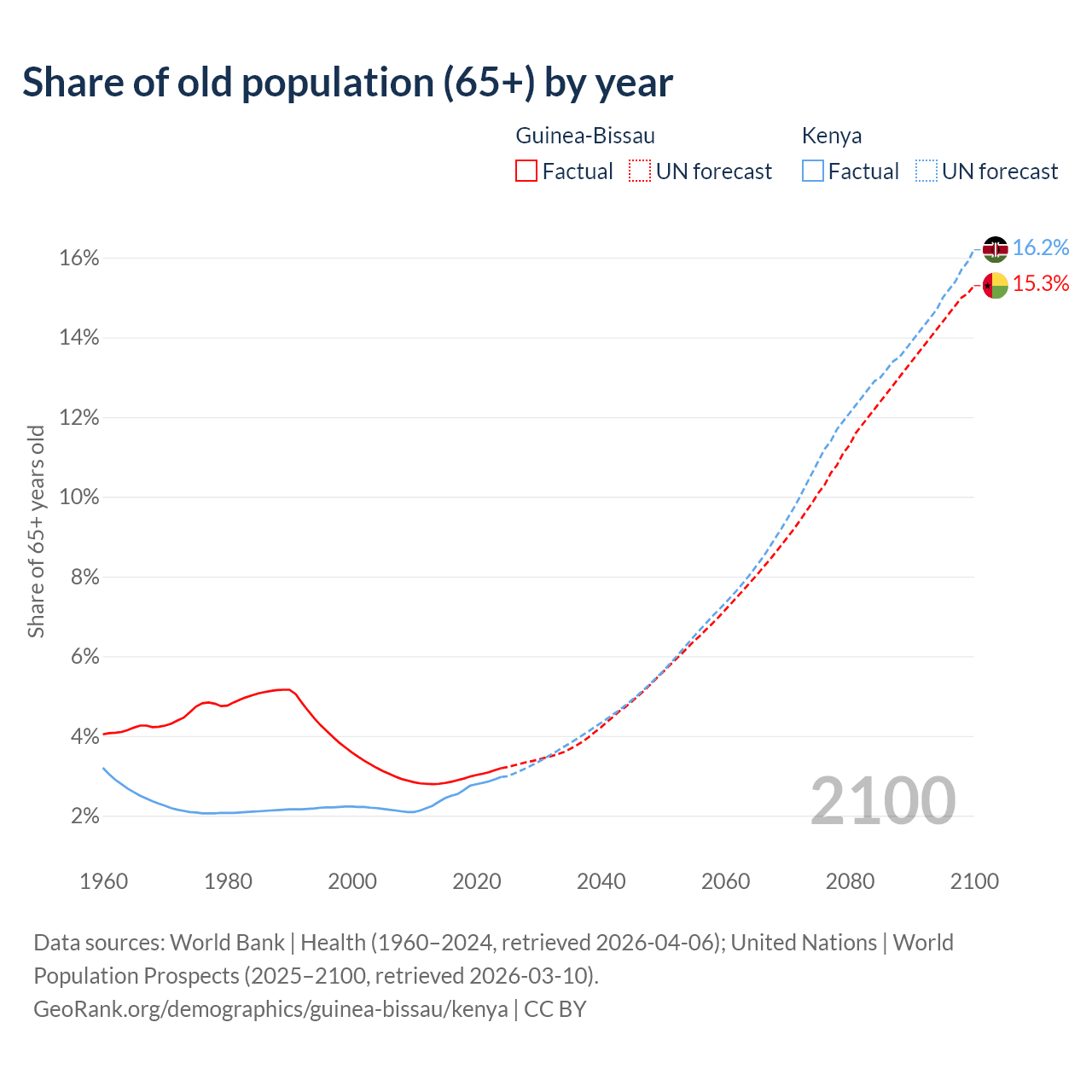 The share of older people aged 65 and over is 3.19% in Guinea-Bissau and 2.97% in Kenya. Life expectancy in Guinea-Bissau compared to Kenya .