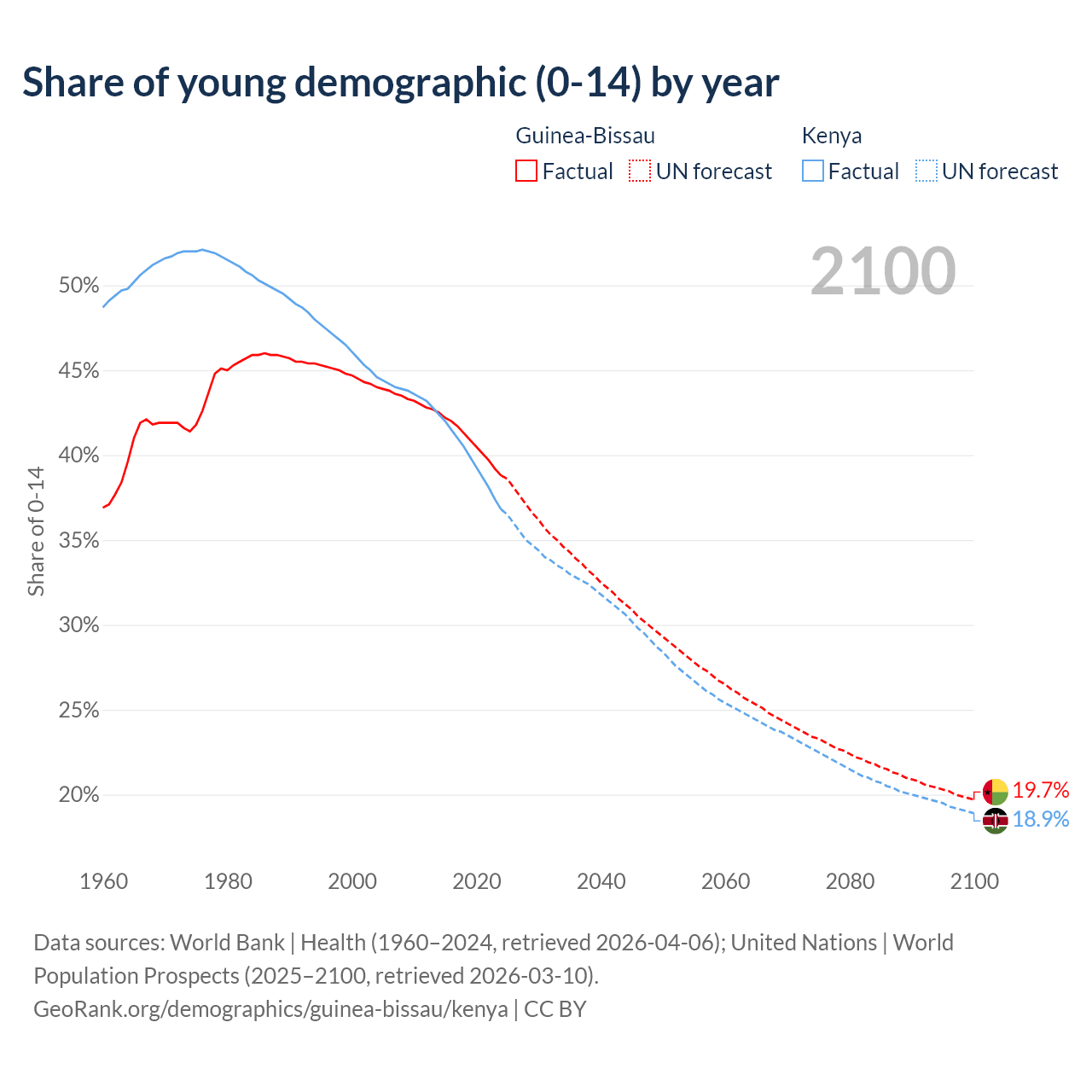 Median age Guinea-Bissau vs Kenya, 1960-2100