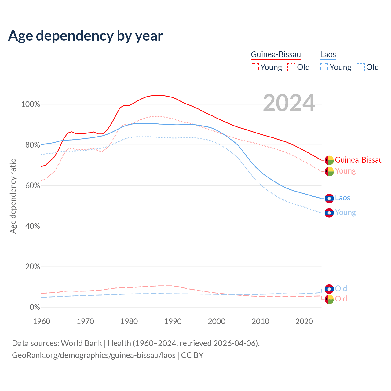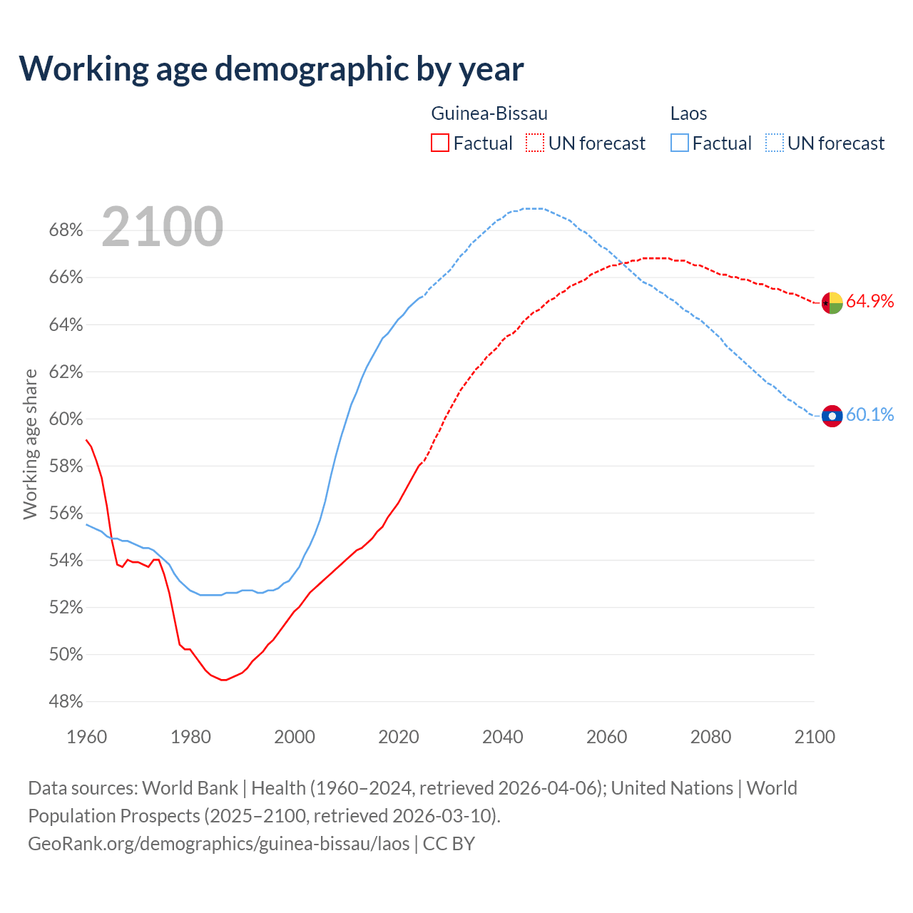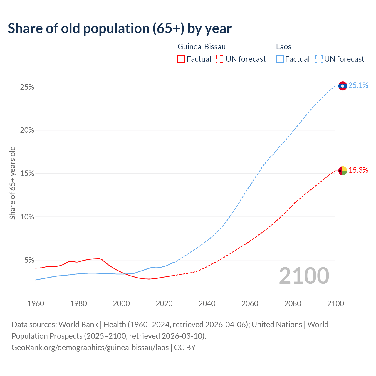 - The share of old-age demographic (65+) in Guinea-Bissau is 3.19% vs 4.67% in Laos.