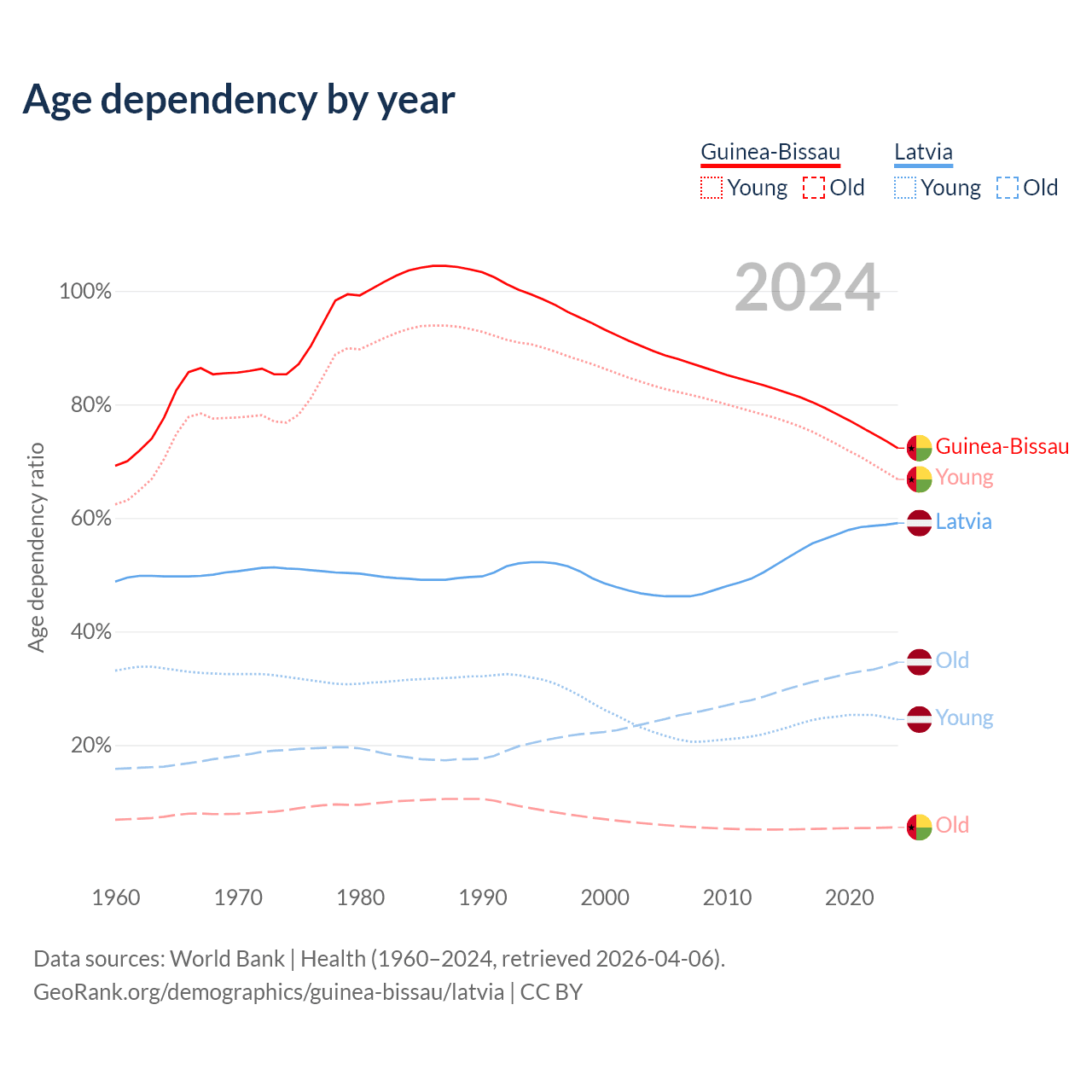 - The share of old-age demographic (65+) in Guinea-Bissau is 3.19% vs 21.7% in Latvia.
