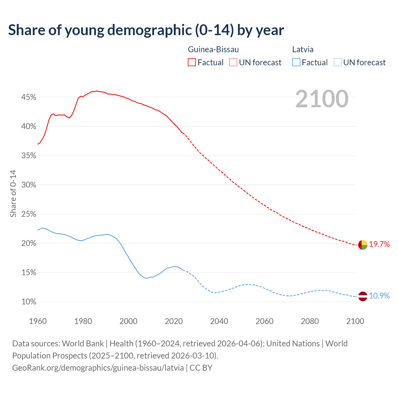 - The share of young demographic (0-15 years old) in Guinea-Bissau is 38.8% vs 15.4% in Latvia.