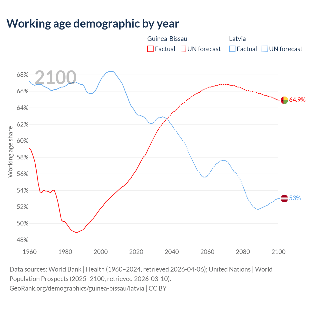 Median age Guinea-Bissau vs Latvia, 1960-2100