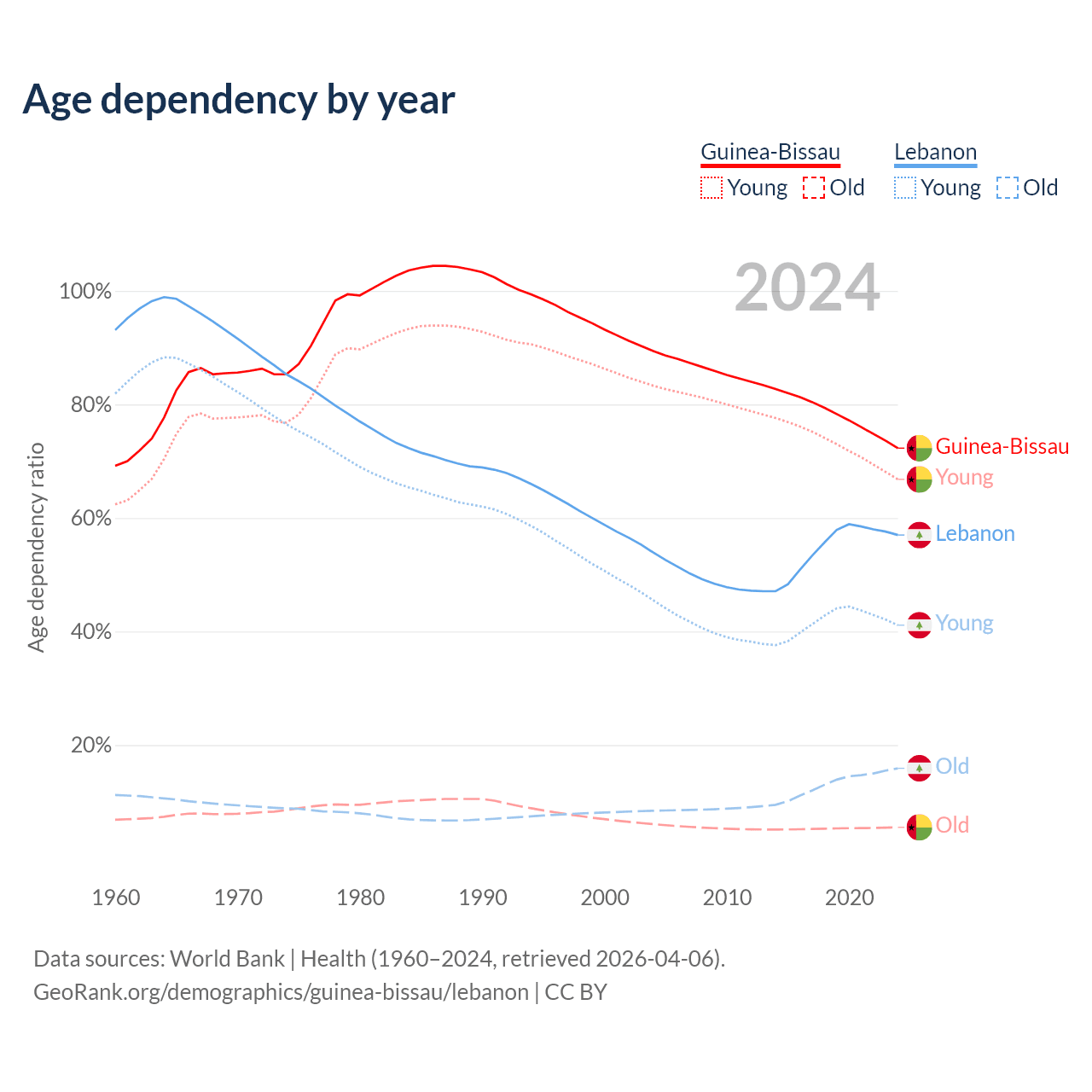 - The share of old-age demographic (65+) in Guinea-Bissau is 3.19% vs 10.1% in Lebanon.