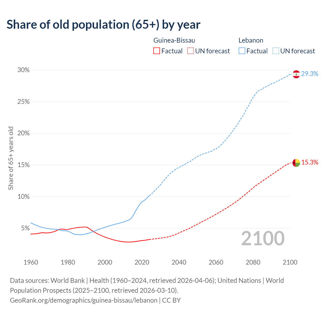 The share of older people aged 65 and over is 3.19% in Guinea-Bissau and 10.1% in Lebanon. Life expectancy in Guinea-Bissau compared to Lebanon .