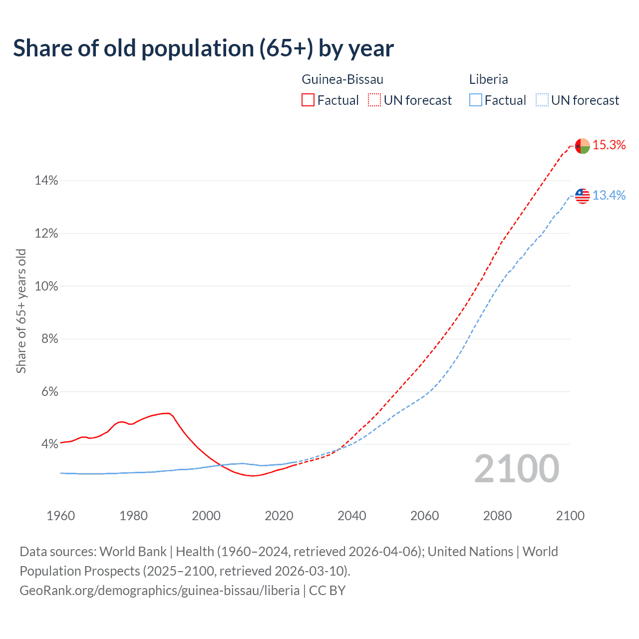 - The share of old-age demographic (65+) in Guinea-Bissau is 3.19% vs 3.3% in Liberia.