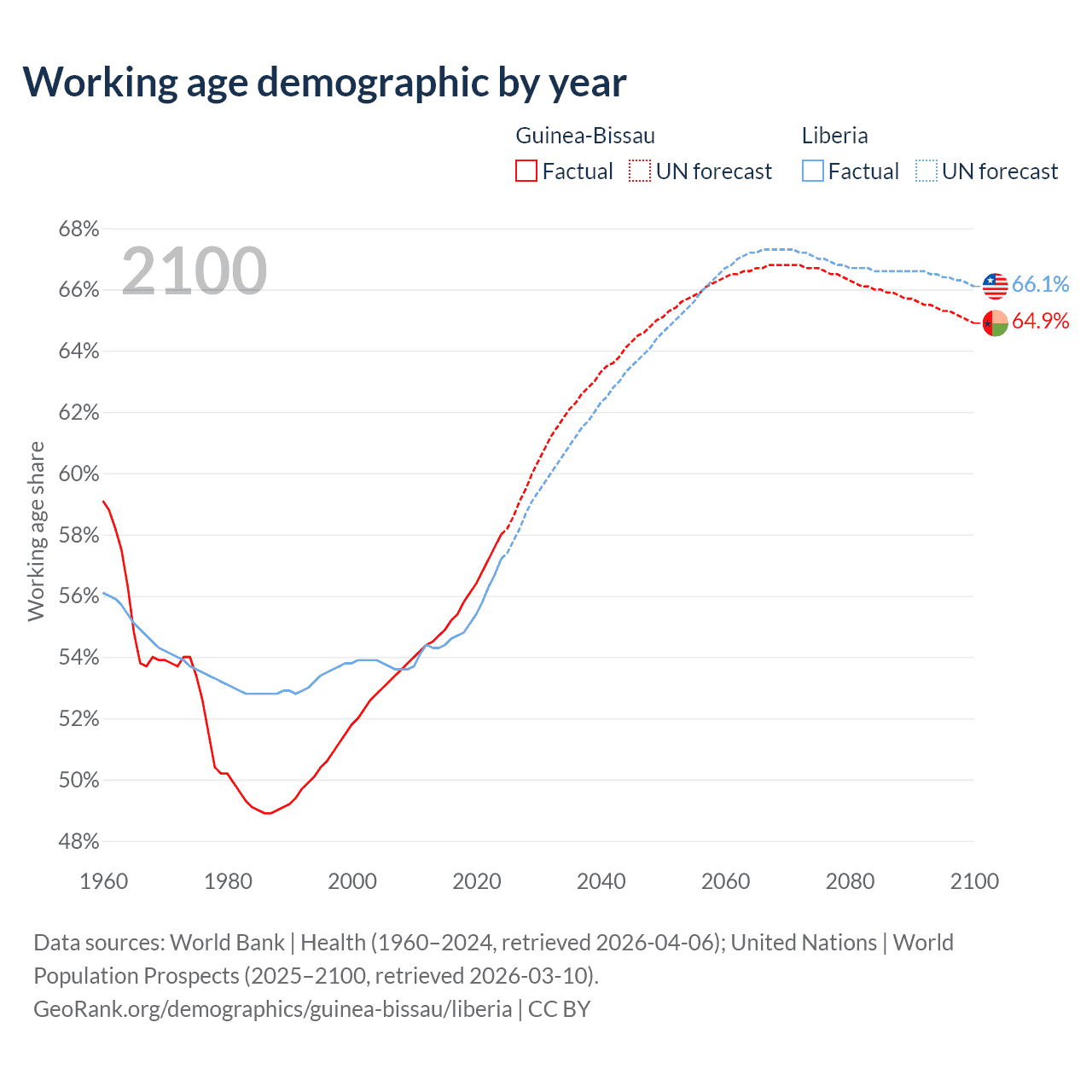 Median age Guinea-Bissau vs Liberia, 1960-2100