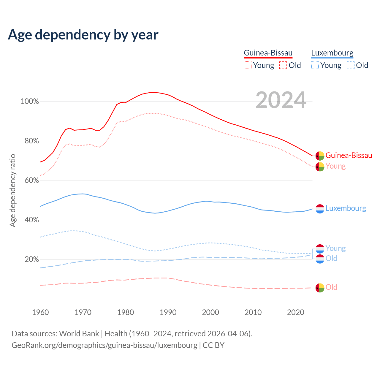 - The share of old-age demographic (65+) in Guinea-Bissau is 3.19% vs 15.5% in Luxembourg.