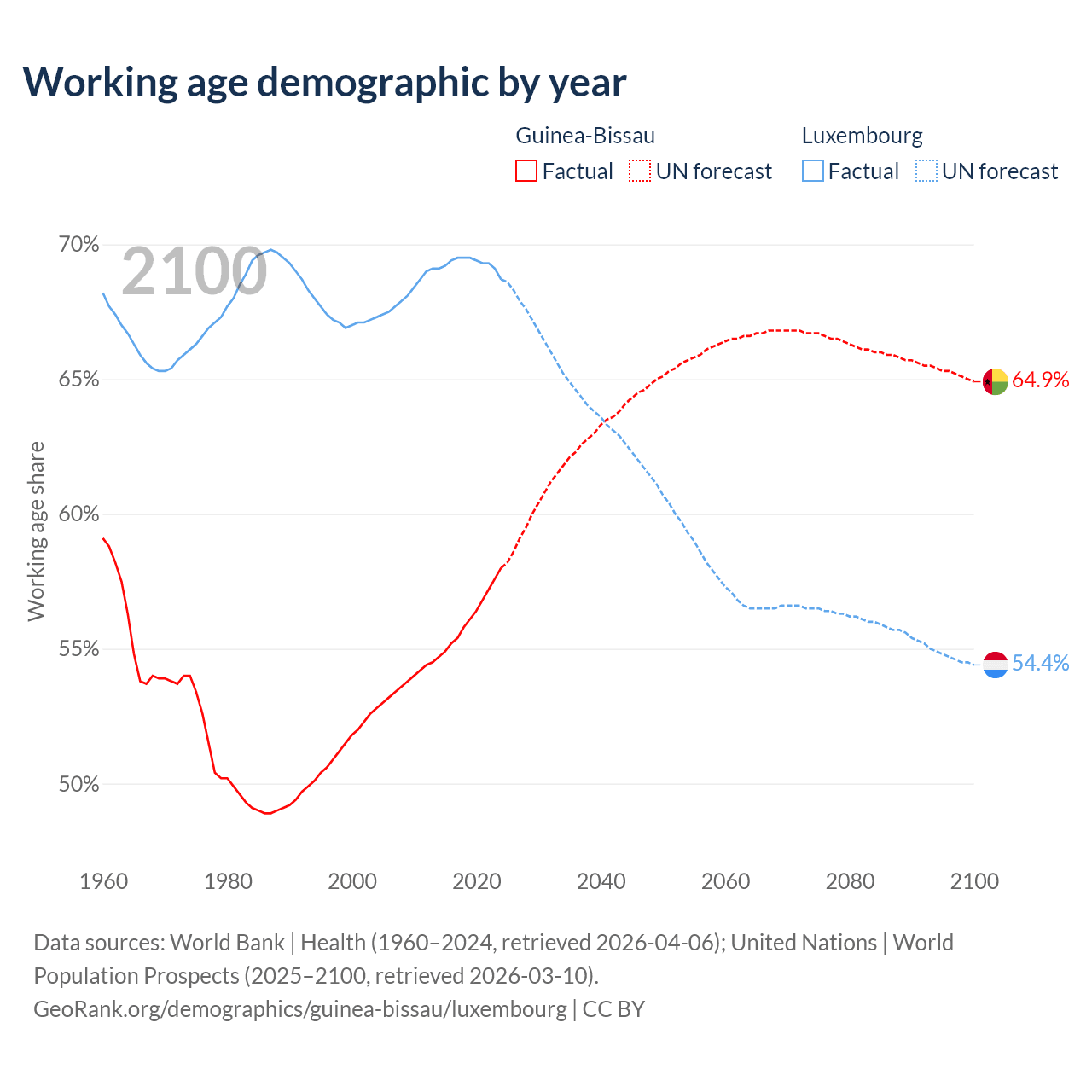 - Guinea-Bissau has 1.34M working age adults (aged 15-64) vs 477K in Luxembourg.