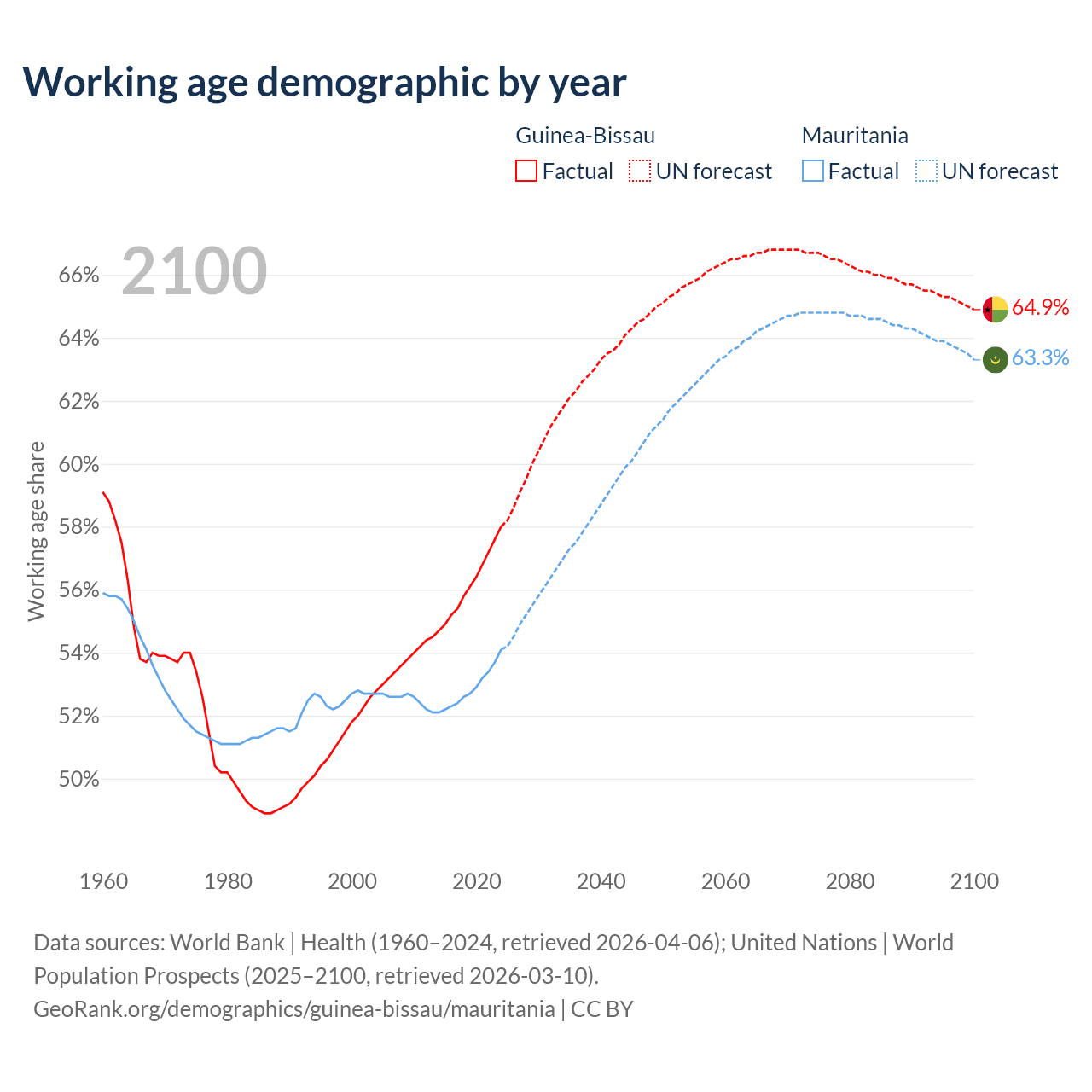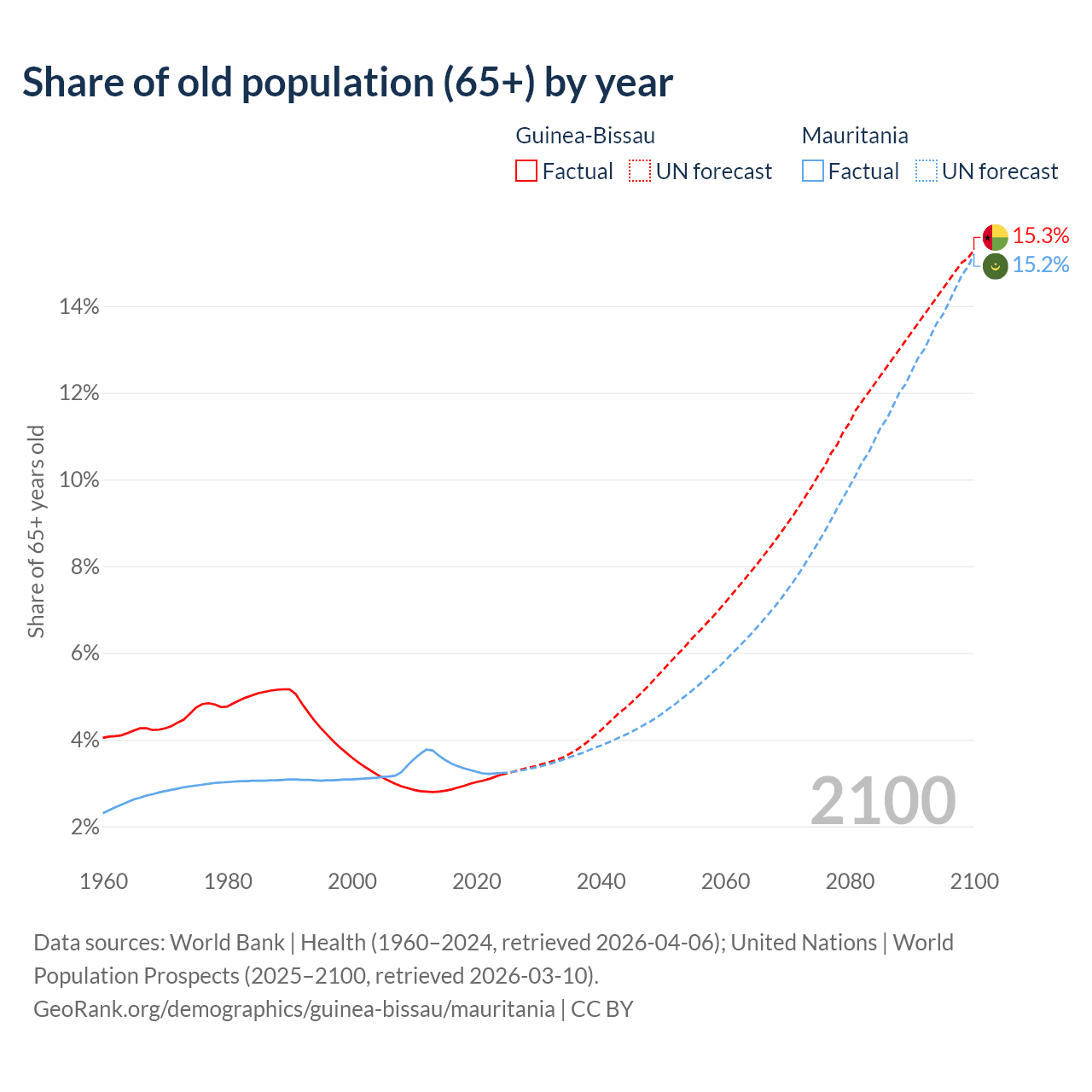 - The share of old-age demographic (65+) in Guinea-Bissau is 3.19% vs 3.23% in Mauritania.