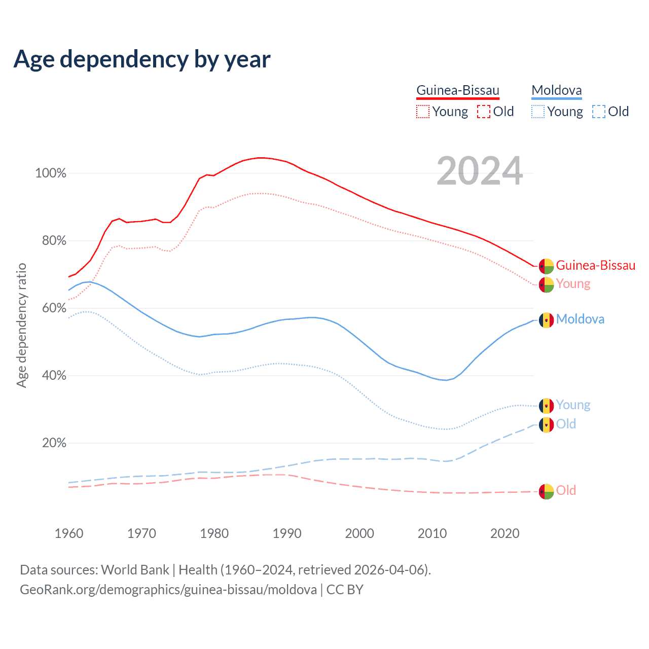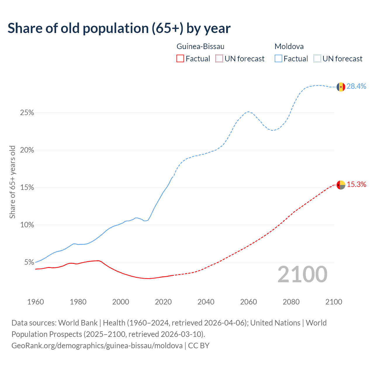 - The share of old-age demographic (65+) in Guinea-Bissau is 3.19% vs 16.2% in Moldova.