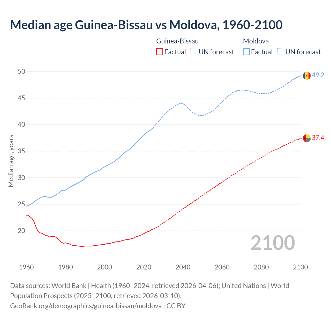 - Guinea-Bissau is ranked 164/196 by median age (oldest to youngest) vs 54/196 for Moldova.