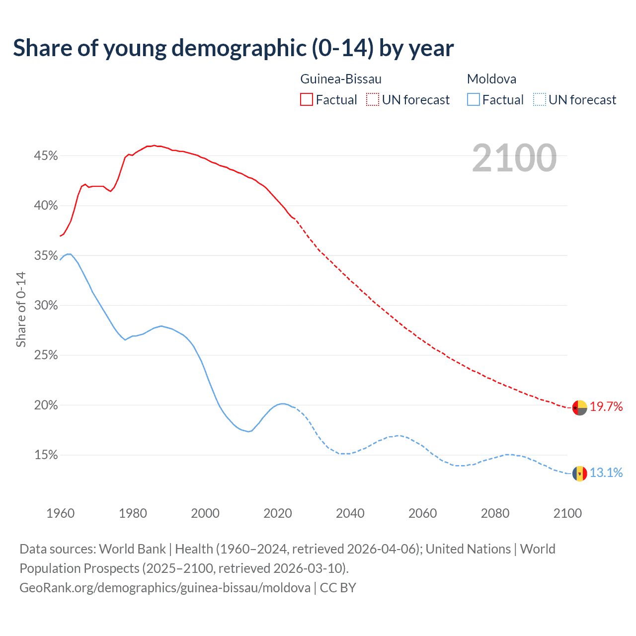 - The share of young demographic (0-15 years old) in Guinea-Bissau is 38.8% vs 19.8% in Moldova.