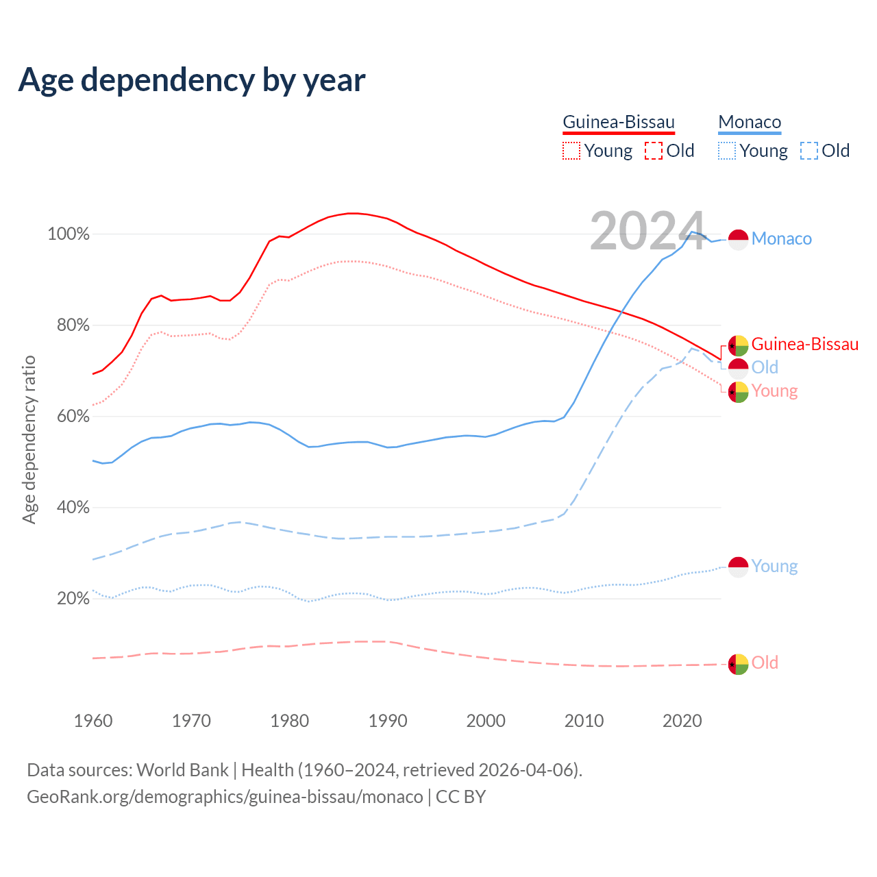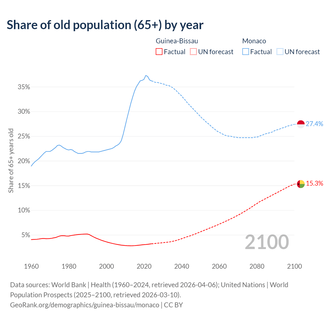 - The share of old-age demographic (65+) in Guinea-Bissau is 3.19% vs 36.2% in Monaco.
