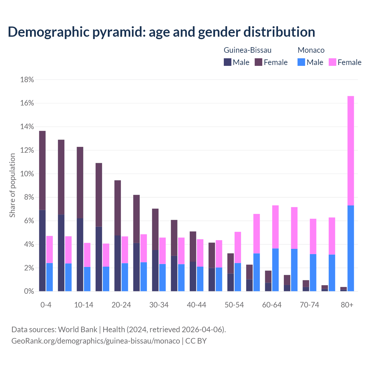 - Guinea-Bissau is ranked 164/196 by median age (oldest to youngest) vs 1/196 for Monaco.