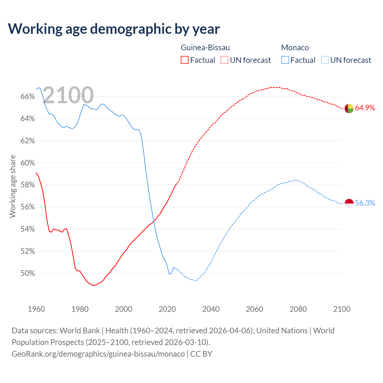 - Guinea-Bissau has 1.34M working age adults (aged 15-64) vs 19.2K in Monaco.