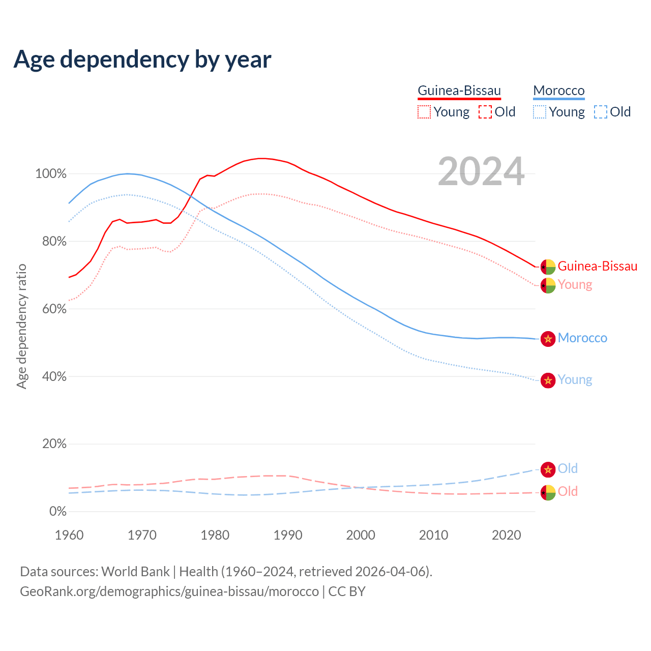 - The share of old-age demographic (65+) in Guinea-Bissau is 3.19% vs 8.14% in Morocco.