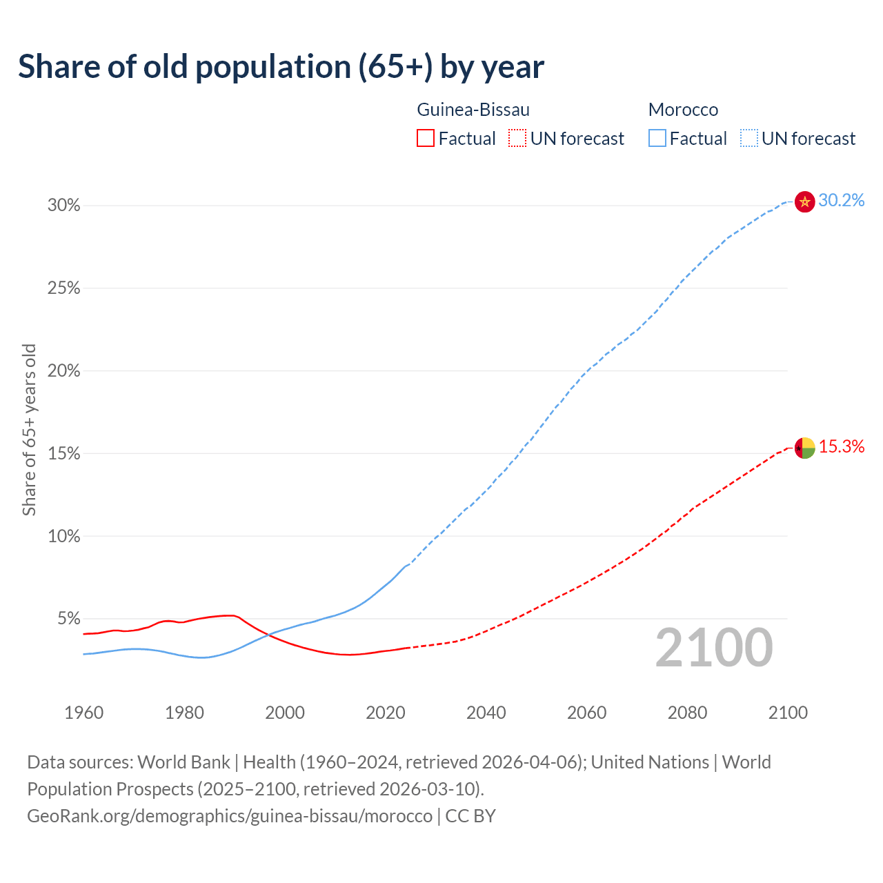 The share of older people aged 65 and over is 3.19% in Guinea-Bissau and 8.14% in Morocco. Life expectancy in Guinea-Bissau compared to Morocco .