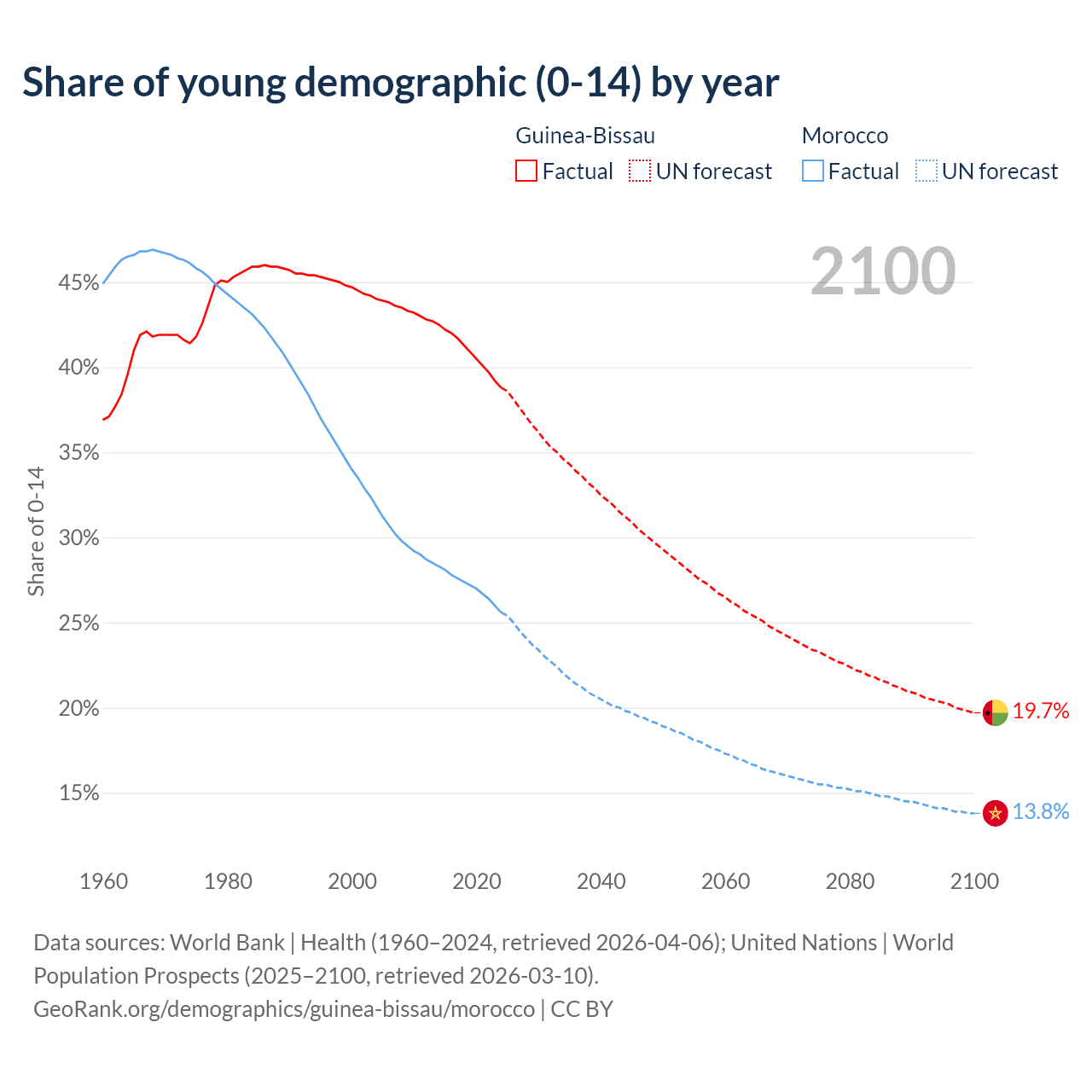 - The share of young demographic (0-15 years old) in Guinea-Bissau is 38.8% vs 25.6% in Morocco.